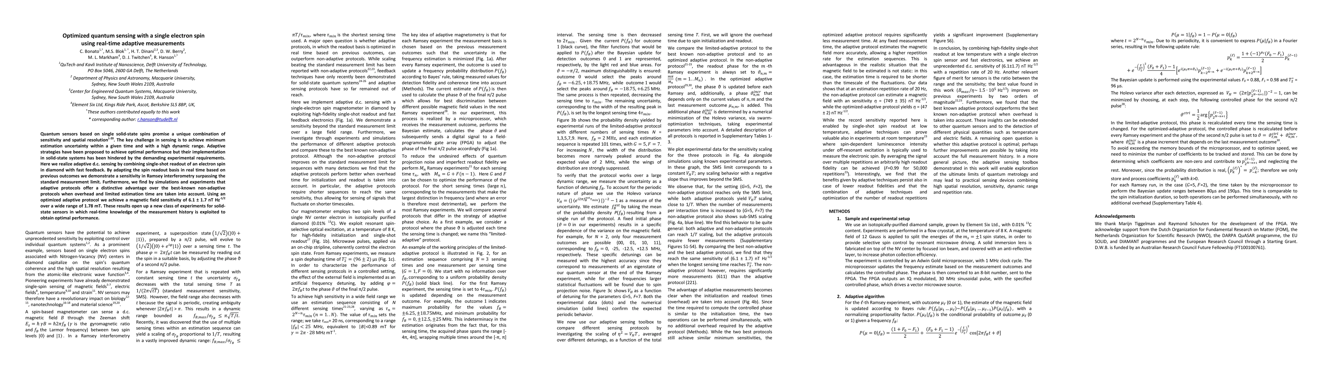 This paper demonstrates optimized quantum sensing using a single electron spin in diamond, achieving adaptive d.c. sensing with real-time feedback to surpass standard measurement limits. The study shows a magnetic field sensitivity of $6.1 \pm 1.7$ nT *Hz$^{-1/2}$, highlighting the advantage of adaptive protocols over non-adaptive ones in solid-state sensors.