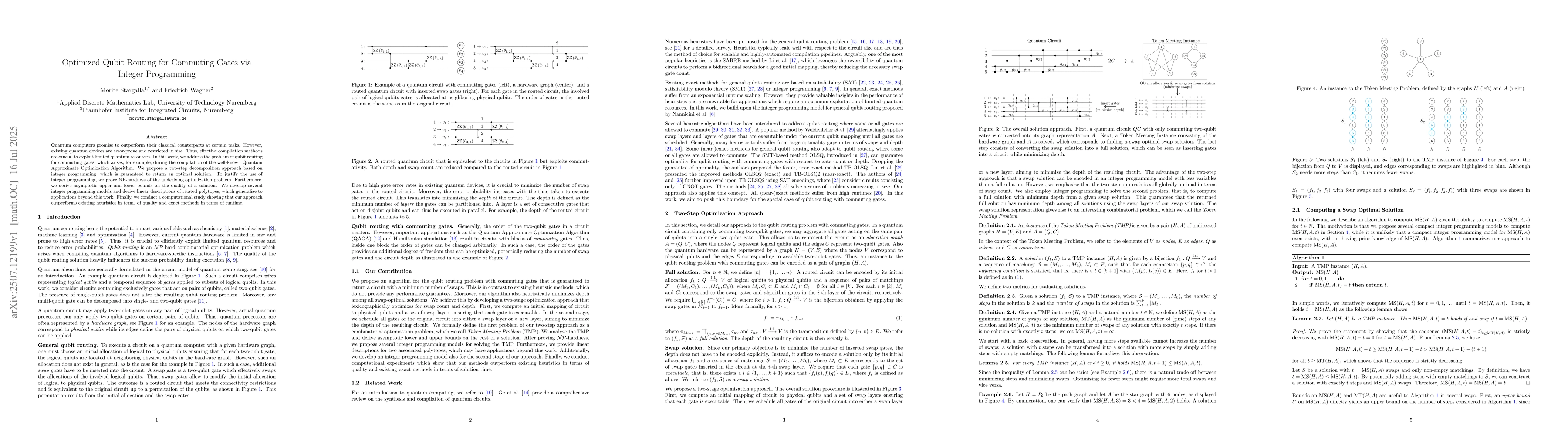 Quantum computers promise to outperform their classical counterparts at certain tasks. However, existing quantum devices are error-prone and restricted in size. Thus, effective compilation methods are crucial to exploit limited quantum resources. In this work, we address the problem of qubit routing for commuting gates, which arises, for example, during the compilation of the well-known Quantum Approximate Optimization Algorithm. We propose a two-step decomposition approach based on integer programming, which is guaranteed to return an optimal solution. To justify the use of integer programming, we prove NP-hardness of the underlying optimization problem. Furthermore, we derive asymptotic upper and lower bounds on the quality of a solution. We develop several integer programming models and derive linear descriptions of related polytopes, which generalize to applications beyond this work. Finally, we conduct a computational study showing that our approach outperforms existing heuristics in terms of quality and exact methods in terms of runtime.