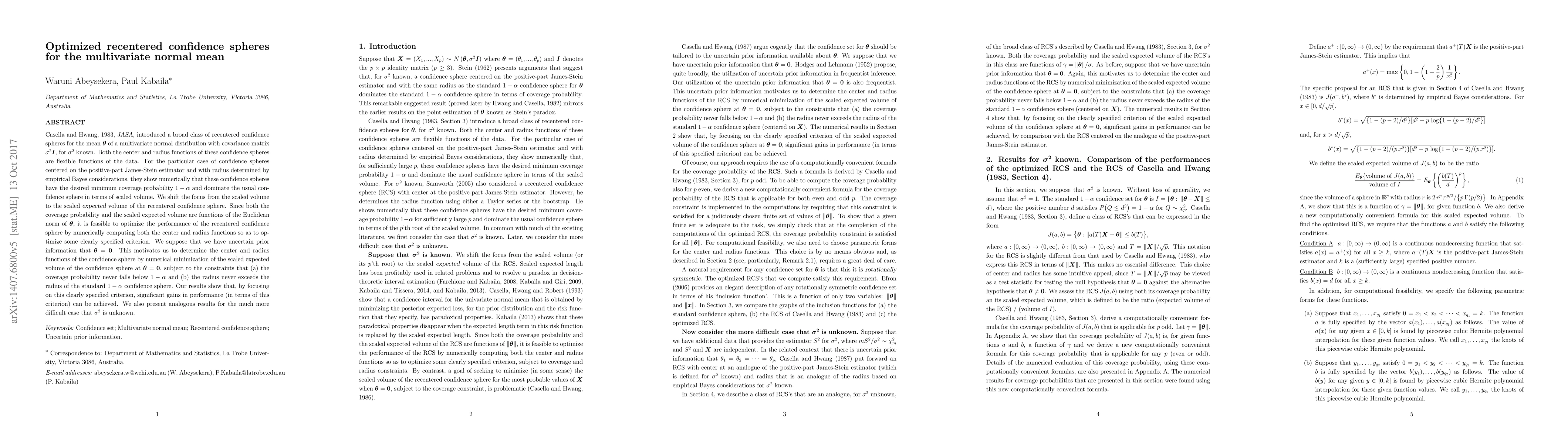 Casella and Hwang, 1983, JASA, introduced a broad class of recentered confidence spheres for the mean $\boldsymbol{\theta}$ of a multivariate normal distribution with covariance matrix $\sigma^2 \boldsymbol{I}$, for $\sigma^2$ known. Both the center and radius functions of these confidence spheres are flexible functions of the data. For the particular case of confidence spheres centered on the positive-part James-Stein estimator and with radius determined by empirical Bayes considerations, they show numerically that these confidence spheres have the desired minimum coverage probability $1-\alpha$ and dominate the usual confidence sphere in terms of scaled volume. We shift the focus from the scaled volume to the scaled expected volume of the recentered confidence sphere. Since both the coverage probability and the scaled expected volume are functions of the Euclidean norm of $\boldsymbol{\theta}$, it is feasible to optimize the performance of the recentered confidence sphere by numerically computing both the center and radius functions so as to optimize some clearly specified criterion. We suppose that we have uncertain prior information that $\boldsymbol{\theta}= \boldsymbol{0}$. This motivates us to determine the center and radius functions of the confidence sphere by numerical minimization of the scaled expected volume of the confidence sphere at $\boldsymbol{\theta}= \boldsymbol{0}$, subject to the constraints that (a) the coverage probability never falls below $1-\alpha$ and (b) the radius never exceeds the radius of the standard $1-\alpha$ confidence sphere. Our results show that, by focusing on this clearly specified criterion, significant gains in performance (in terms of this criterion) can be achieved. We also present analogous results for the much more difficult case that $\sigma^2$ is unknown.
