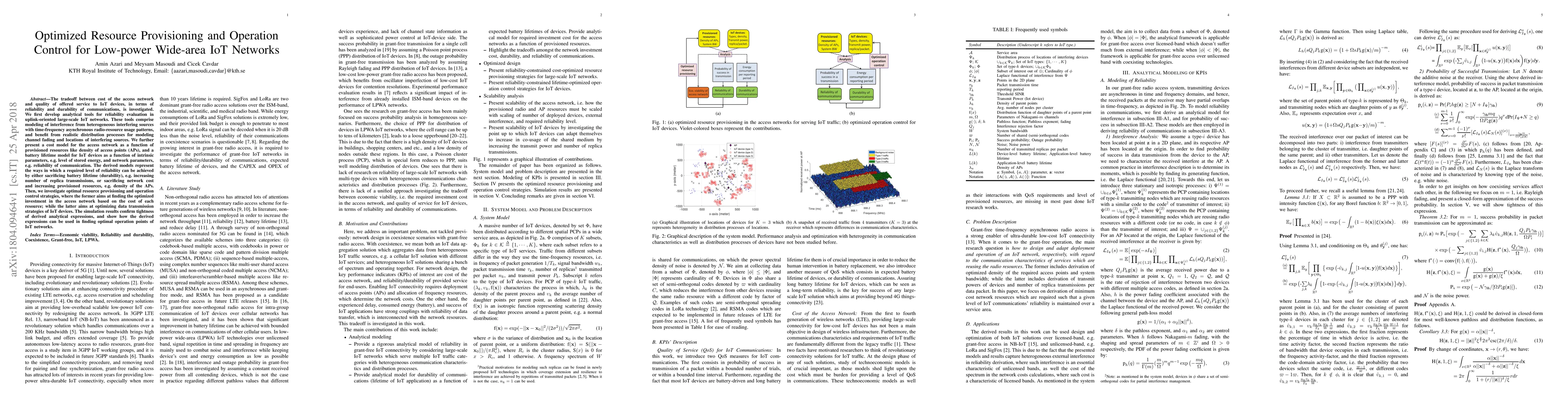 The tradeoff between cost of the access network and quality of offered service to IoT devices, in terms of reliability and durability of communications, is investigated. We first develop analytical tools for reliability evaluation in uplink-oriented large-scale IoT networks. These tools comprise modeling of interference from heterogeneous interfering sources with time-frequency asynchronous radio-resource usage patterns, and benefit from realistic distribution processes for modeling channel fading and locations of interfering sources. We further present a cost model for the access network as a function of provisioned resources like density of access points (APs), and a battery lifetime model for IoT devices as a function of intrinsic parameters, e.g. level of stored energy, and network parameters, e.g. reliability of communication. The derived models represent the ways in which a required level of reliability can be achieved by either sacrificing battery lifetime (durability), e.g. increasing number of replica transmissions, or sacrificing network cost and increasing provisioned resources, e.g. density of the APs. Then, we investigate optimal resource provisioning and operation control strategies, where the former aims at finding the optimized investment in the access network based on the cost of each resource; while the latter aims at optimizing data transmission strategies of IoT devices. The simulation results confirm tightness of derived analytical expressions, and show how the derived expressions can be used in finding optimal operation points of IoT networks.