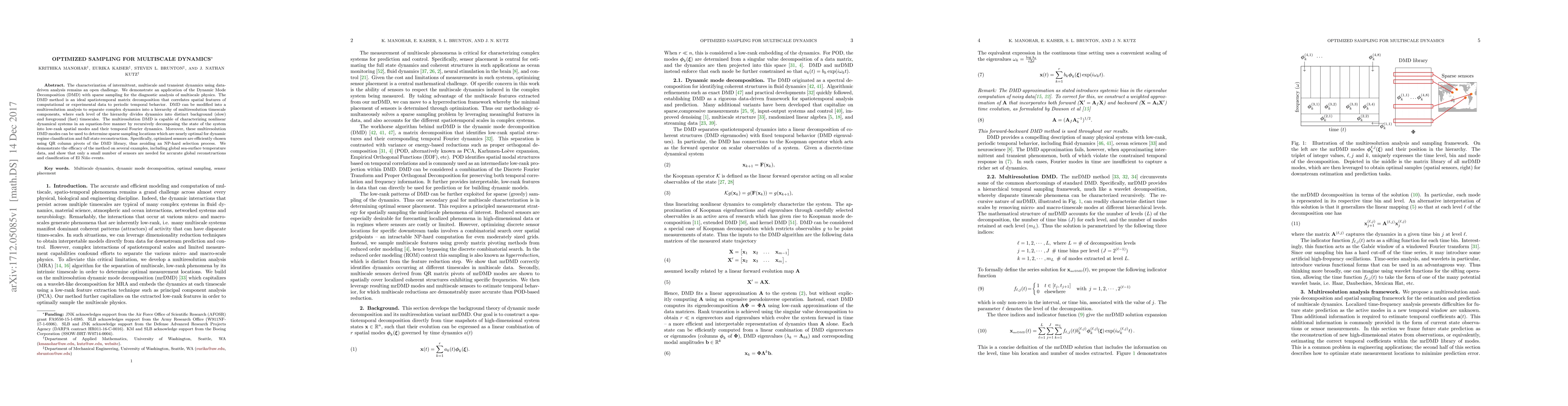 The characterization of intermittent, multiscale and transient dynamics using data-driven analysis remains an open challenge. We demonstrate an application of the Dynamic Mode Decomposition (DMD) with sparse sampling for the diagnostic analysis of multiscale physics. The DMD method is an ideal spatiotemporal matrix decomposition that correlates spatial features of computational or experimental data to periodic temporal behavior. DMD can be modified into a multiresolution analysis to separate complex dynamics into a hierarchy of multiresolution timescale components, where each level of the hierarchy divides dynamics into distinct background (slow) and foreground (fast) timescales. The multiresolution DMD is capable of characterizing nonlinear dynamical systems in an equation-free manner by recursively decomposing the state of the system into low-rank spatial modes and their temporal Fourier dynamics. Moreover, these multiresolution DMD modes can be used to determined sparse sampling locations which are nearly optimal for dynamic regime classification and full state reconstruction. Specifically, optimized sensors are efficiently chosen using QR column pivots of the DMD library, thus avoiding an NP-hard selection process. We demonstrate the efficacy of the method on several examples, including global sea-surface temperature data, and show that only a small number of sensors are needed for accurate global reconstructions and classification of El Ni\~no events.