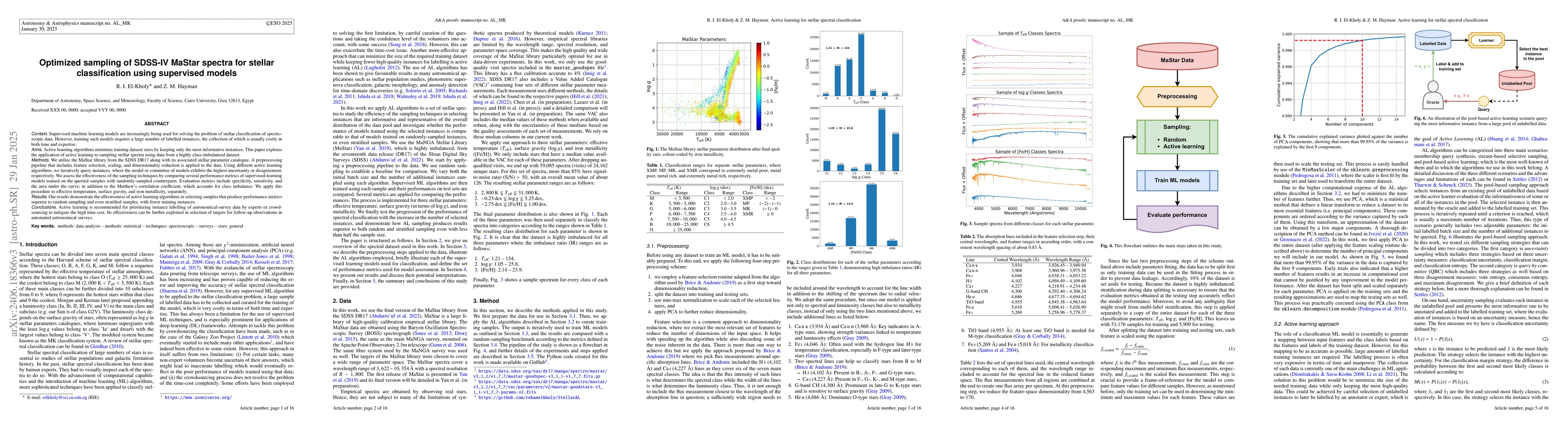 This paper investigates the use of active learning algorithms to optimize the sampling of MaStar spectra from SDSS-IV for stellar classification, demonstrating that these methods can yield better performance metrics with fewer training instances compared to random sampling. The study finds active learning to be an efficient approach for instance labelling and target selection in astronomical surveys.