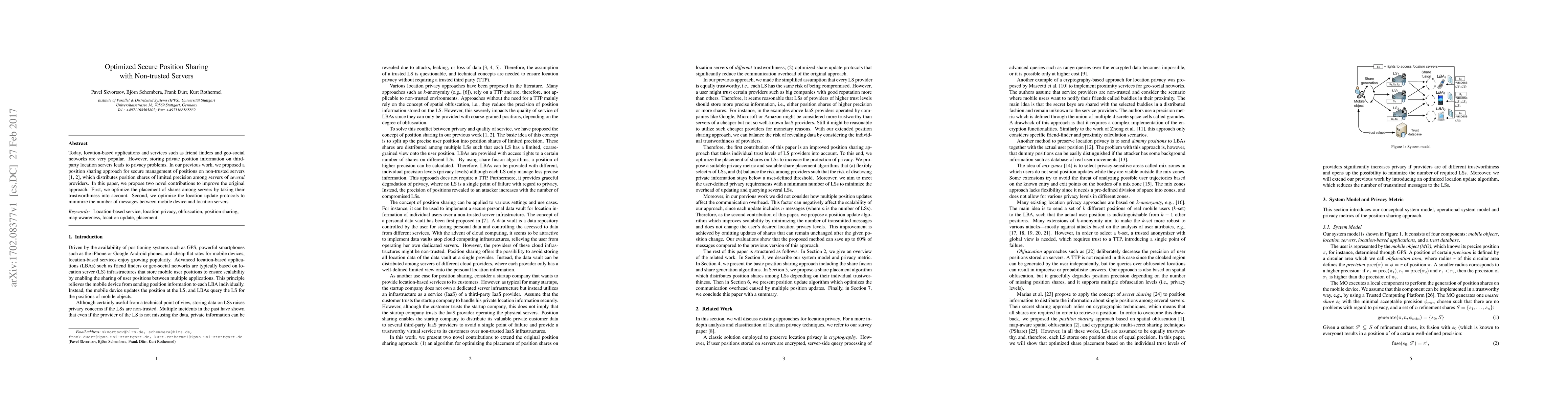 This paper enhances a secure position sharing method for non-trusted servers by optimizing share placement based on server trustworthiness and refining location update protocols to reduce communication overhead between mobile devices and servers.