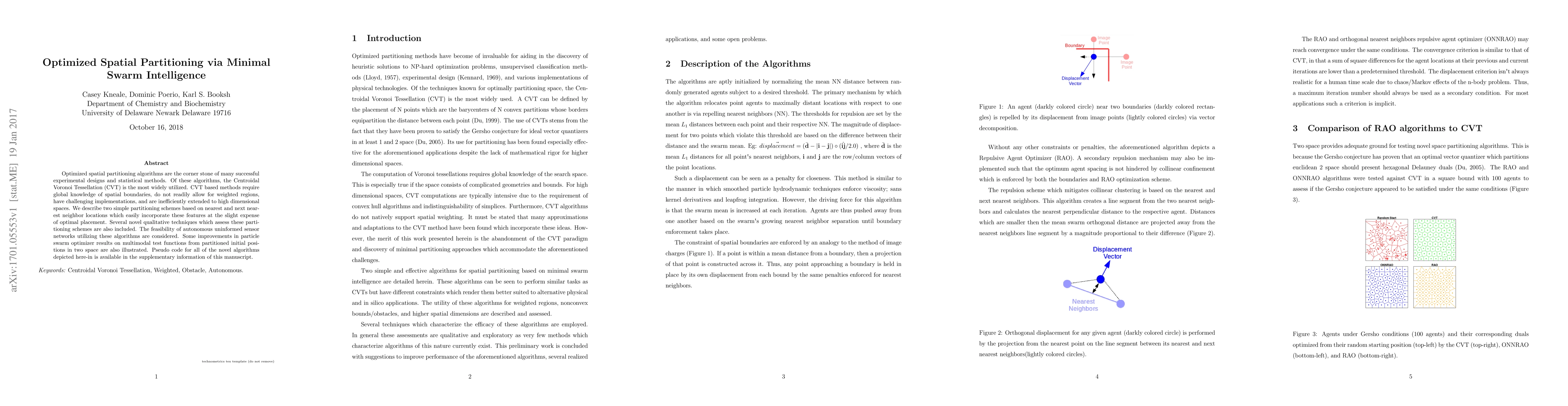 Optimized spatial partitioning algorithms are the corner stone of many successful experimental designs and statistical methods. Of these algorithms, the Centroidal Voronoi Tessellation (CVT) is the most widely utilized. CVT based methods require global knowledge of spatial boundaries, do not readily allow for weighted regions, have challenging implementations, and are inefficiently extended to high dimensional spaces. We describe two simple partitioning schemes based on nearest and next nearest neighbor locations which easily incorporate these features at the slight expense of optimal placement. Several novel qualitative techniques which assess these partitioning schemes are also included. The feasibility of autonomous uninformed sensor networks utilizing these algorithms are considered. Some improvements in particle swarm optimizer results on multimodal test functions from partitioned initial positions in two space are also illustrated. Pseudo code for all of the novel algorithms depicted here-in is available in the supplementary information of this manuscript.