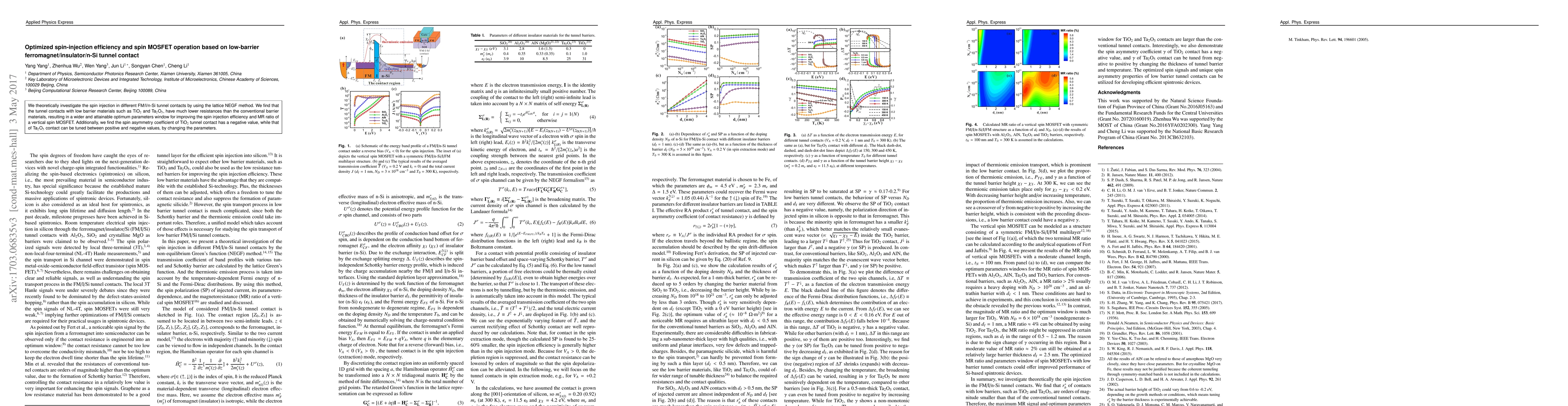 This research uses the lattice NEGF method to theoretically analyze spin injection in FM/I/n-Si tunnel contacts, finding that low-barrier materials like TiO2 and Ta2O5 significantly enhance spin injection efficiency and MR ratio in vertical spin MOSFETs. These materials also allow for tunable spin asymmetry coefficients, ranging from positive to negative values.