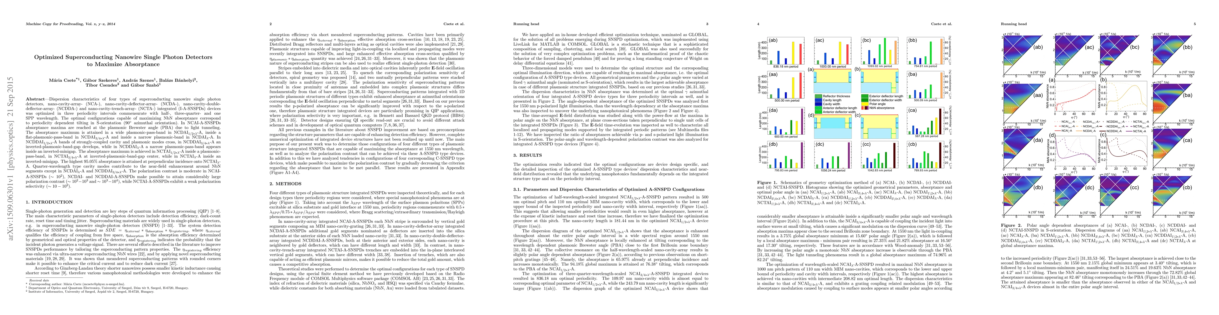 Dispersion characteristics of four types of superconducting nanowire single photon detectors, nano-cavity-array- (NCA-), nano-cavity-deflector-array- (NCDA-), nano-cavity-double-deflector-array- (NCDDA-) and nano-cavity-trench-array- (NCTA-) integrated (I-A-SNSPDs) devices was optimized in three periodicity intervals commensurate with half-, three-quarter- and one SPP wavelength. The optimal configurations capable of maximizing NbN absorptance correspond to periodicity dependent tilting in S-orientation (90{\deg} azimuthal orientation). In NCAI-A-SNSPDs absorptance maxima are reached at the plasmonic Brewster angle (PBA) due to light tunneling. The absorptance maximum is attained in a wide plasmonic-pass-band in NCDAI_1/2*lambda-A, inside a flat-plasmonic-pass-band in NCDAI_3/4*lambda-A and inside a narrow plasmonic-band in NCDAI_lambda-A. In NCDDAI_1/2*lambda-A bands of strongly-coupled cavity and plasmonic modes cross, in NCDDAI_3/4*lambda-A an inverted-plasmonic-band-gap develops, while in NCDDAI_lambda-A a narrow plasmonic-pass-band appears inside an inverted-minigap. The absorptance maximum is achieved in NCTAI_1/2*lambda-A inside a plasmonic-pass-band, in NCTAI_3/4*lambda-A at inverted-plasmonic-band-gap center, while in NCTAI_lambda-A inside an inverted-minigap. The highest 95.05% absorptance is attained at perpendicular incidence onto NCTAI_lambda-A. Quarter-wavelength type cavity modes contribute to the near-field enhancement around NbN segments except in NCDAI_lambda-A and NCDDAI_3/4*lambda-A. The polarization contrast is moderate in NCAI-A-SNSPDs (~10^2), NCDAI- and NCDDAI-A-SNSPDs make possible to attain considerably large polarization contrast (~10^2-10^3 and ~10^3-10^4), while NCTAI-A-SNSPDs exhibit a weak polarization selectivity (~10-10^2).
