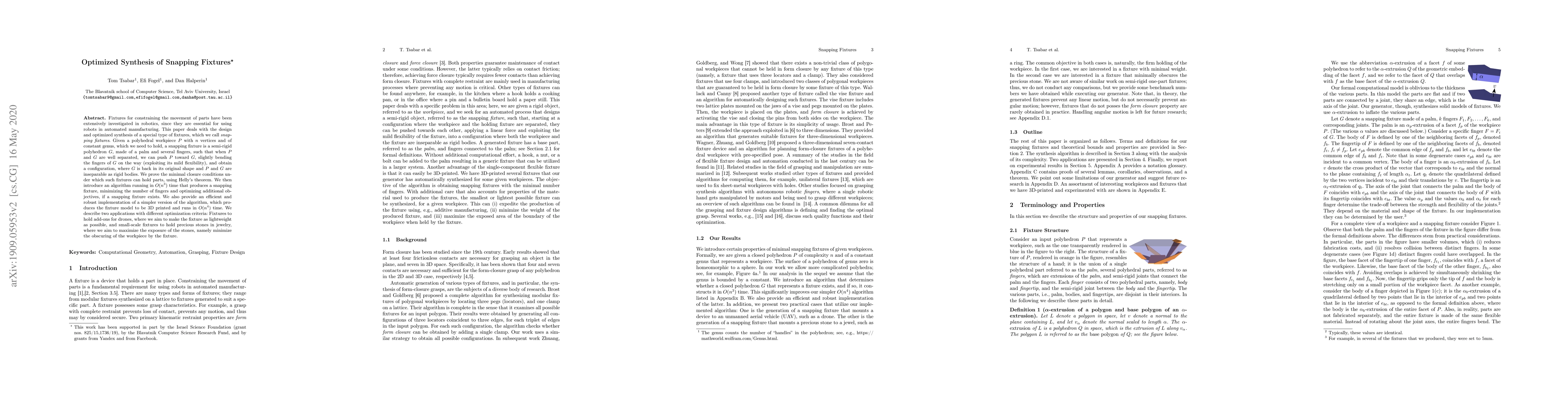 This paper explores the design and optimized synthesis of snapping fixtures, which are semi-rigid polyhedral devices used to constrain parts in robotics. The authors propose an algorithm for creating these fixtures, minimizing the number of components and optimizing for specific applications, such as lightweight fixtures for drones and fixtures for jewelry that maximize stone exposure.