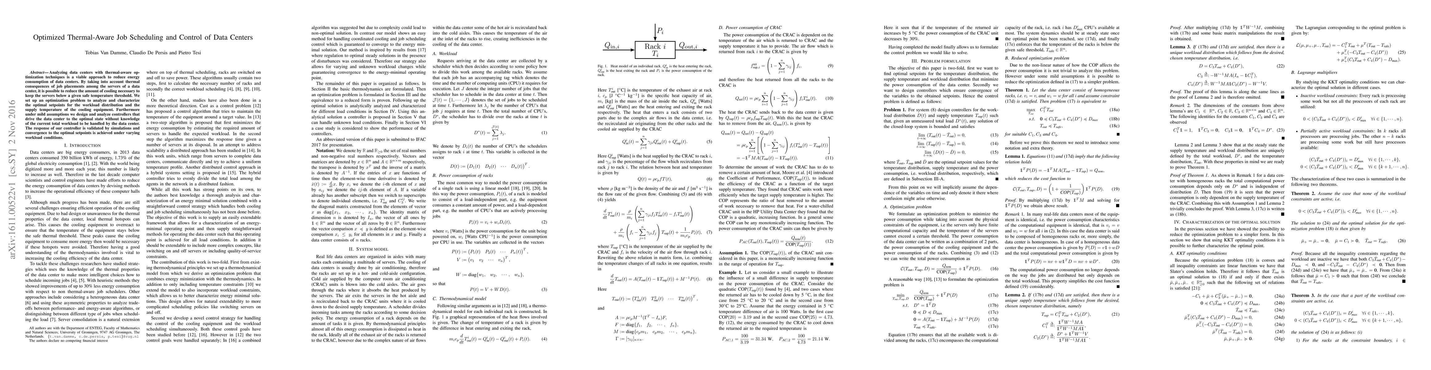 This paper proposes thermal-aware optimization techniques for data centers to reduce energy consumption by minimizing cooling needs through optimal job placement. The authors develop controllers that achieve optimal workload distribution and cooling setpoints without prior knowledge of total workload, validated by simulations showing convergence under varying conditions.