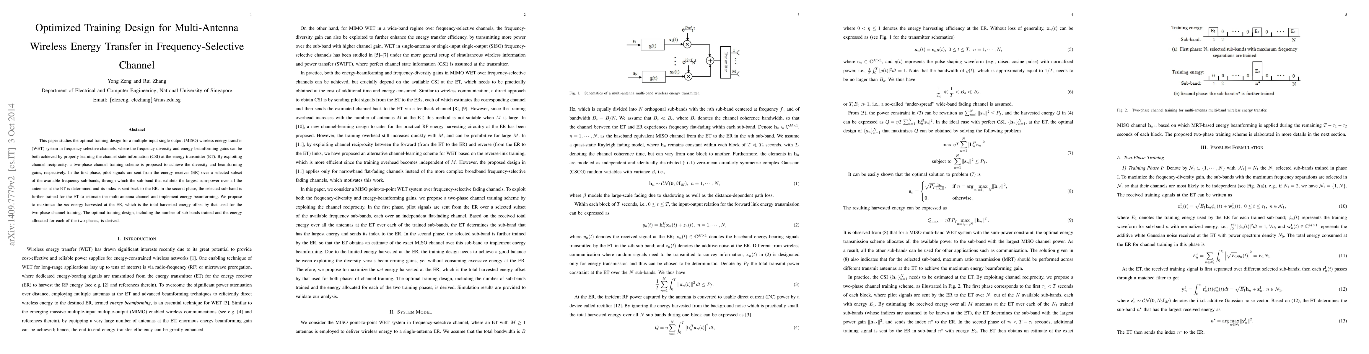 This paper proposes an optimal two-phase channel training scheme for a MISO wireless energy transfer system in frequency-selective channels, aiming to maximize net energy harvested by balancing training and energy beamforming gains. The scheme determines the best sub-band for energy transfer and optimizes training allocation.