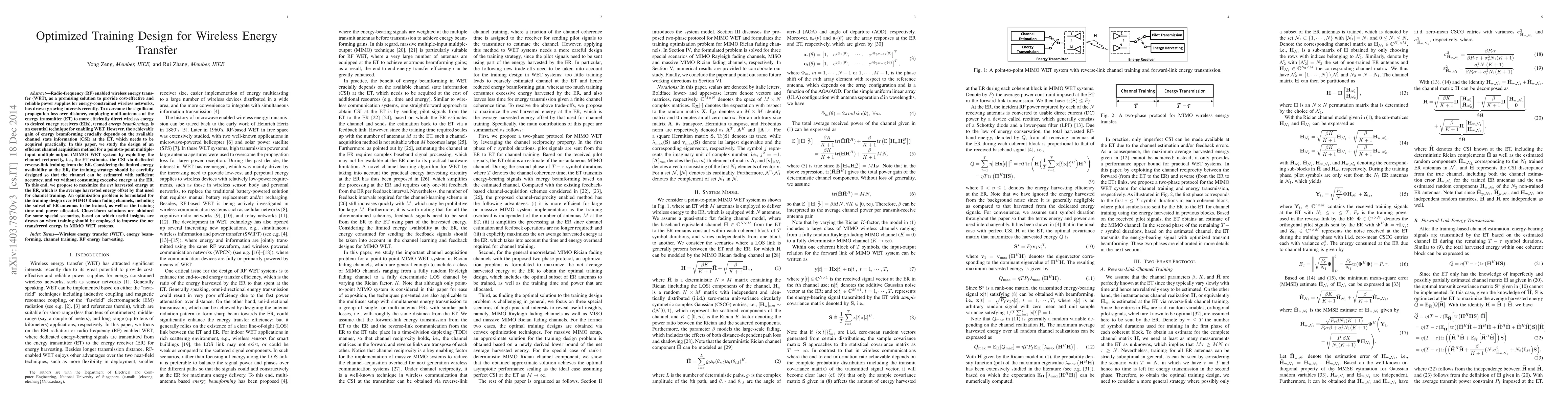 This paper proposes an optimized training design for wireless energy transfer (WET) using multi-antennas to mitigate propagation loss. It aims to maximize the net harvested energy at energy receivers by carefully balancing channel estimation accuracy with energy consumption, formulating an optimization problem for training strategies in MIMO Rician fading channels.