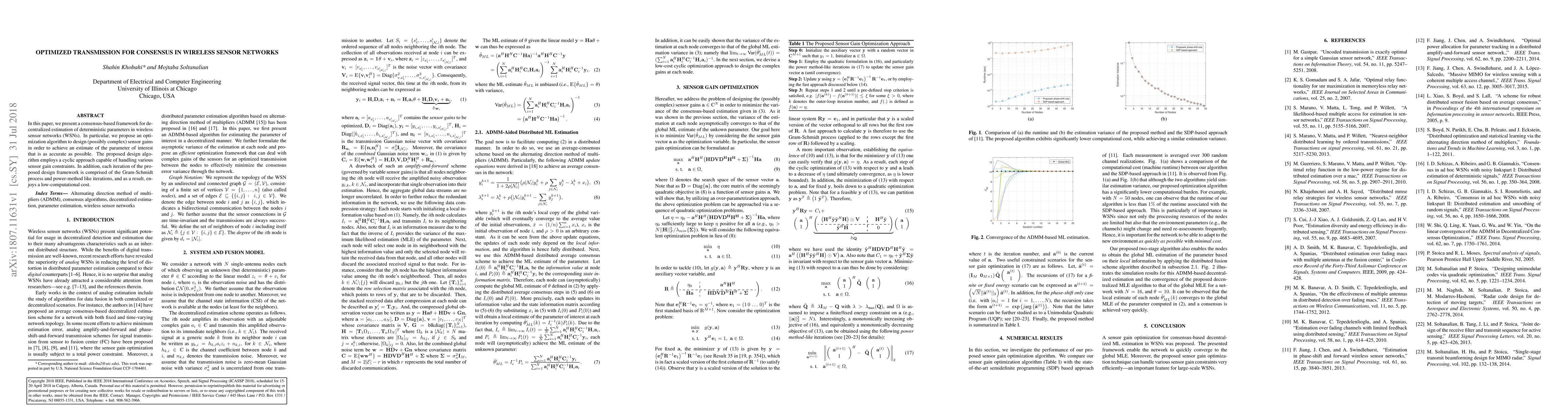 In this paper, we present a consensus-based framework for decentralized estimation of deterministic parameters in wireless sensor networks (WSNs). In particular, we propose an optimization algorithm to design (possibly complex) sensor gains in order to achieve an estimate of the parameter of interest that is as accurate as possible. The proposed design algorithm employs a cyclic approach capable of handling various sensor gain constraints. In addition, each iteration of the proposed design framework is comprised of the Gram-Schmidt process and power-method like iterations, and as a result, enjoys a low-computational cost.