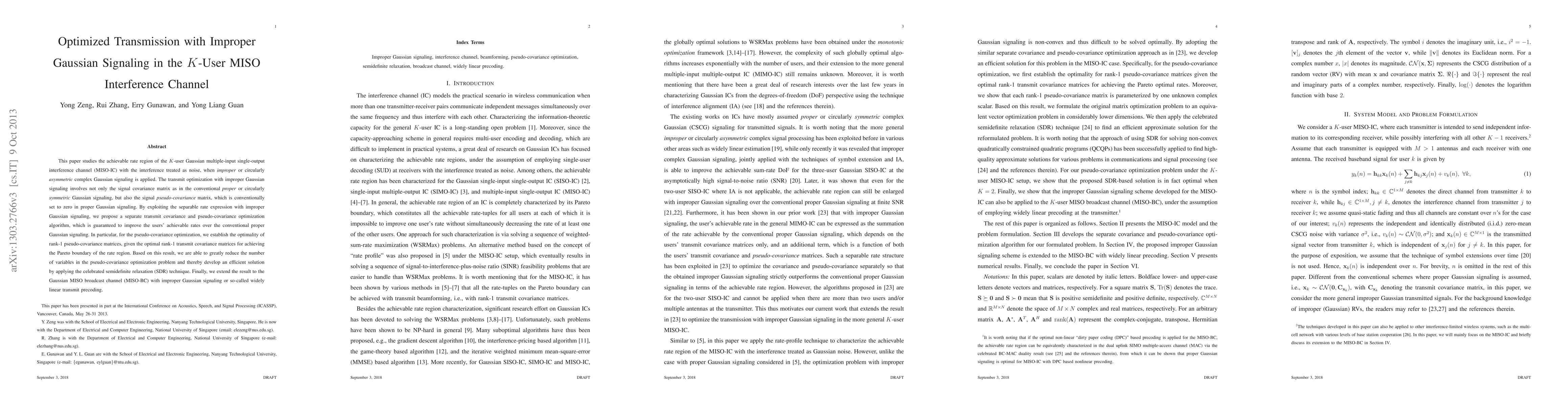 This paper studies the achievable rate region of the K-user Gaussian multiple-input single-output interference channel (MISO-IC) with the interference treated as noise, when improper or circularly asymmetric complex Gaussian signaling is applied. The transmit optimization with improper Gaussian signaling involves not only the signal covariance matrix as in the conventional proper or circularly symmetric Gaussian signaling, but also the signal pseudo-covariance matrix, which is conventionally set to zero in proper Gaussian signaling. By exploiting the separable rate expression with improper Gaussian signaling, we propose a separate transmit covariance and pseudo-covariance optimization algorithm, which is guaranteed to improve the users' achievable rates over the conventional proper Gaussian signaling. In particular, for the pseudo-covariance optimization, we establish the optimality of rank-1 pseudo-covariance matrices, given the optimal rank-1 transmit covariance matrices for achieving the Pareto boundary of the rate region. Based on this result, we are able to greatly reduce the number of variables in the pseudo-covariance optimization problem and thereby develop an efficient solution by applying the celebrated semidefinite relaxation (SDR) technique. Finally, we extend the result to the Gaussian MISO broadcast channel (MISO-BC) with improper Gaussian signaling or so-called widely linear transmit precoding.