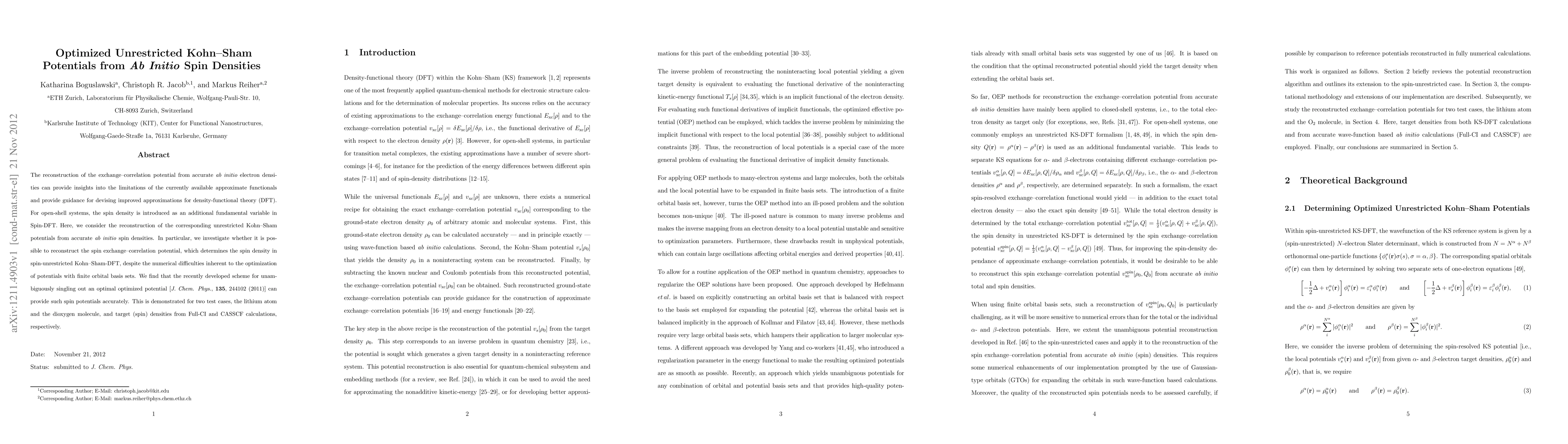 This paper explores reconstructing unrestricted Kohn-Sham potentials from ab initio spin densities to improve density-functional theory (DFT) approximations. It successfully applies a recently developed scheme to accurately determine spin exchange-correlation potentials for open-shell systems, demonstrated through lithium atom and dioxygen molecule examples.