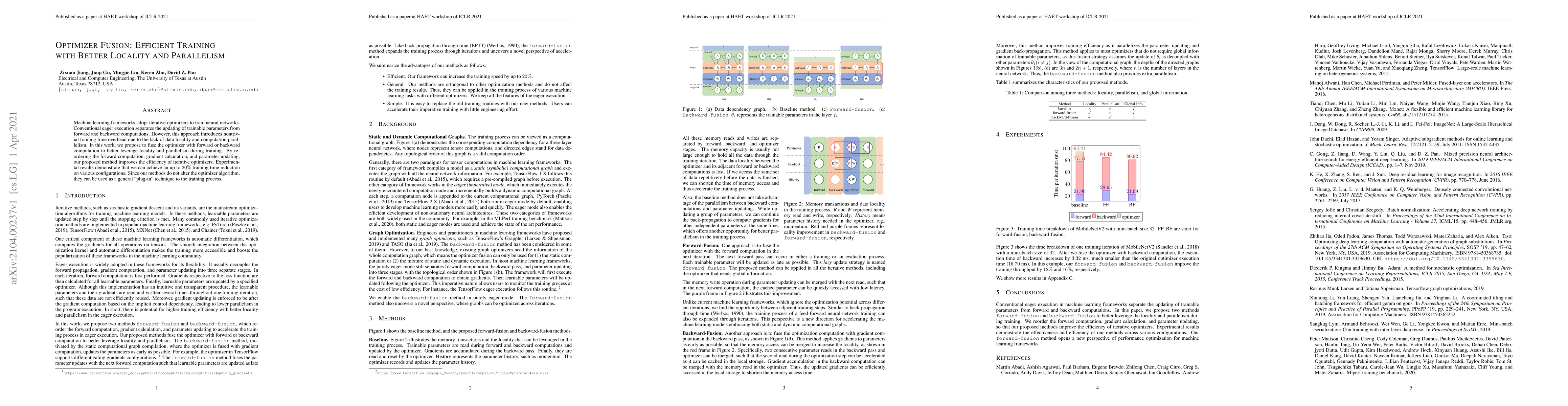 This paper proposes a method to fuse optimizer operations with forward and backward computations to enhance data locality and improve parallelism, achieving up to a 20% reduction in training time for neural networks. The technique can be easily integrated into existing frameworks without changing the optimizer algorithms.