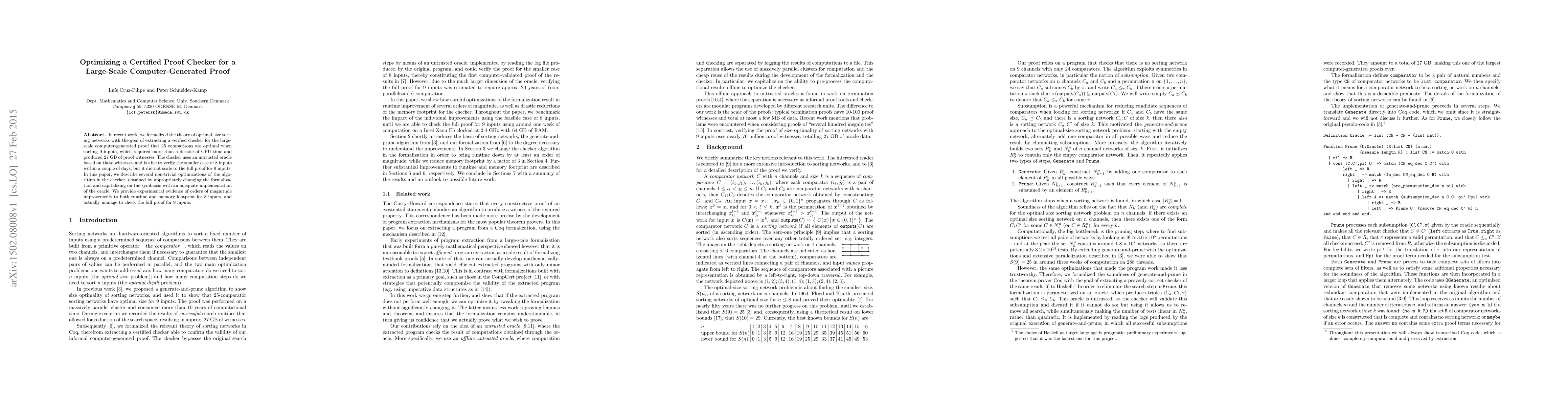 This paper optimizes a certified proof checker for a large-scale computer-generated proof that 25 comparisons are optimal for sorting 9 inputs. Through algorithmic improvements and symbiosis with an oracle, the authors achieve significant reductions in runtime and memory usage, successfully verifying the proof for 9 inputs.