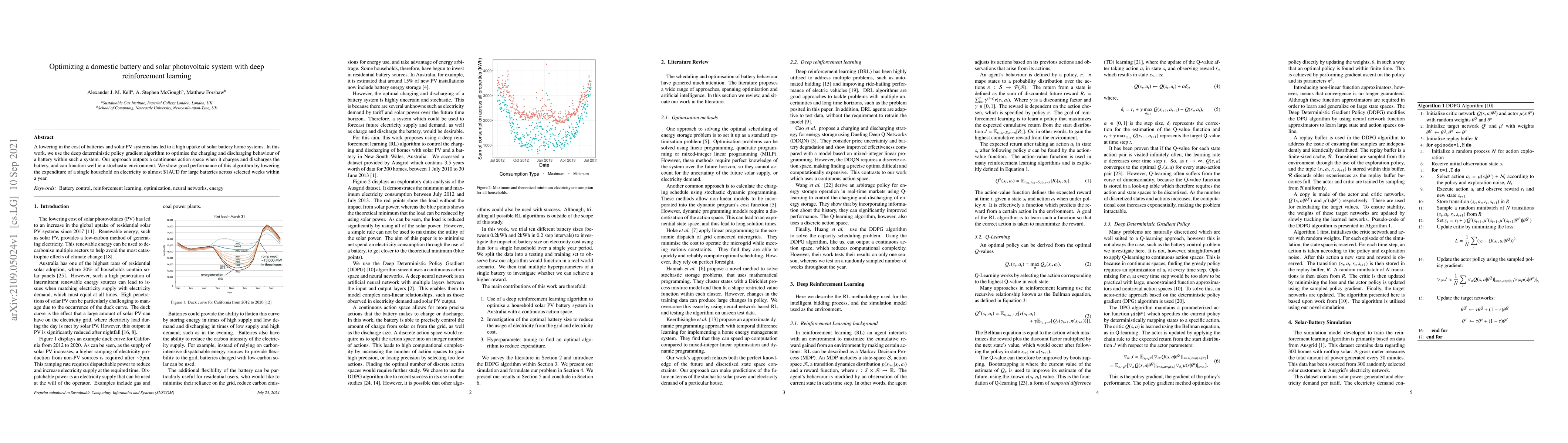 This paper optimizes domestic battery and solar photovoltaic systems using deep reinforcement learning, specifically the deep deterministic policy gradient algorithm, to manage charging and discharging. The approach effectively reduces household electricity costs by nearly \$1AUD for large batteries during selected periods.