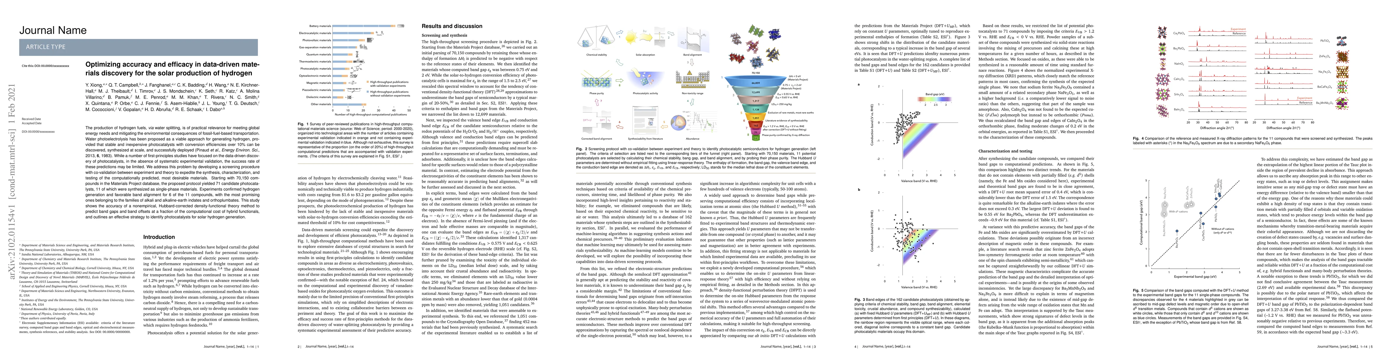 The production of hydrogen fuels, via water splitting, is of practical relevance for meeting global energy needs and mitigating the environmental consequences of fossil-fuel-based transportation. Water photoelectrolysis has been proposed as a viable approach for generating hydrogen, provided that stable and inexpensive photocatalysts with conversion efficiencies over 10% can be discovered, synthesized at scale, and successfully deployed (Pinaud et al., Energy Environ. Sci., 2013, 6, 1983). While a number of first-principles studies have focused on the data-driven discovery of photocatalysts, in the absence of systematic experimental validation, the success rate of these predictions may be limited. We address this problem by developing a screening procedure with co-validation between experiment and theory to expedite the synthesis, characterization, and testing of the computationally predicted, most desirable materials. Starting with 70,150 compounds in the Materials Project database, the proposed protocol yielded 71 candidate photocatalysts, 11 of which were synthesized as single-phase materials. Experiments confirmed hydrogen generation and favorable band alignment for 6 of the 11 compounds, with the most promising ones belonging to the families of alkali and alkaline-earth indates and orthoplumbates. This study shows the accuracy of a nonempirical, Hubbard-corrected density-functional theory method to predict band gaps and band offsets at a fraction of the computational cost of hybrid functionals, and outlines an effective strategy to identify photocatalysts for solar hydrogen generation.