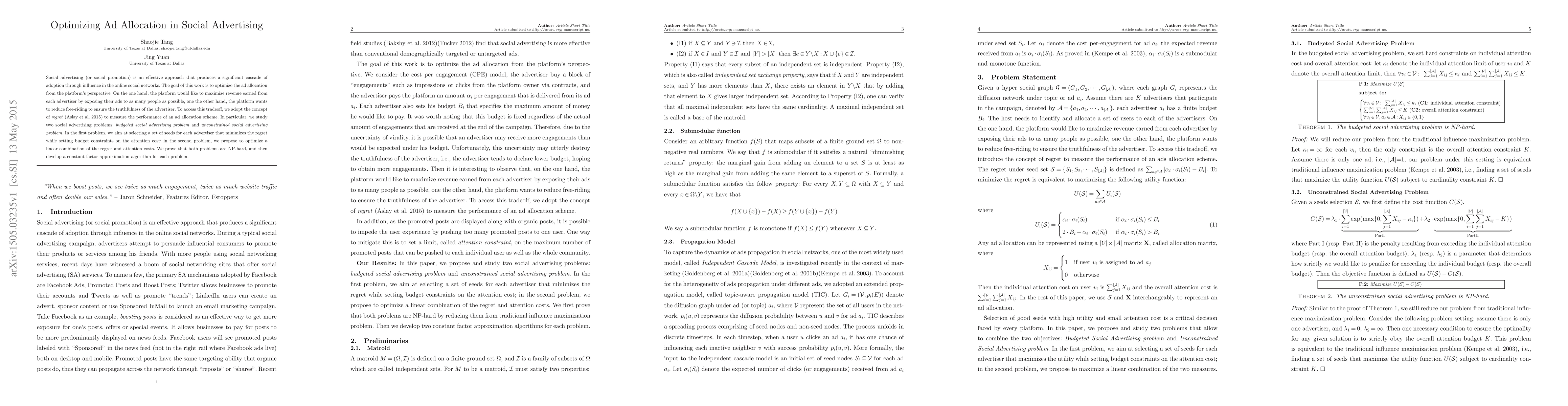 This paper optimizes ad allocation in social advertising to maximize platform revenue while minimizing free-riding. It addresses two problems: budgeted and unconstrained social advertising, proving both are NP-hard and developing constant factor approximation algorithms for each.