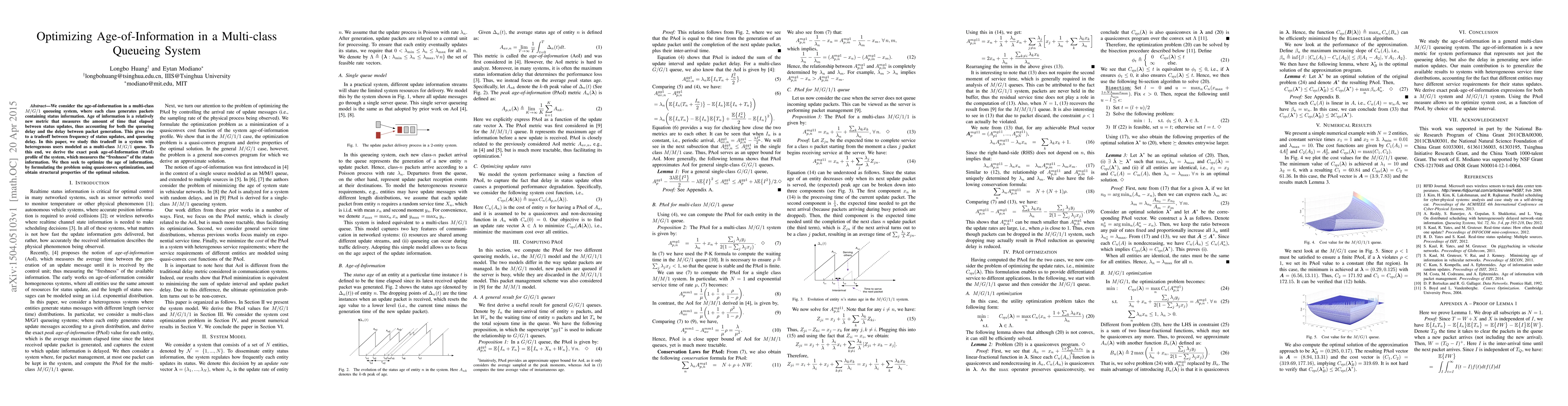 We consider the age-of-information in a multi-class $M/G/1$ queueing system, where each class generates packets containing status information. Age of information is a relatively new metric that measures the amount of time that elapsed between status updates, thus accounting for both the queueing delay and the delay between packet generation. This gives rise to a tradeoff between frequency of status updates, and queueing delay. In this paper, we study this tradeoff in a system with heterogenous users modeled as a multi-class $M/G/1$ queue. To this end, we derive the exact peak age-of-Information (PAoI) profile of the system, which measures the "freshness" of the status information. We then seek to optimize the age of information, by formulating the problem using quasiconvex optimization, and obtain structural properties of the optimal solution.