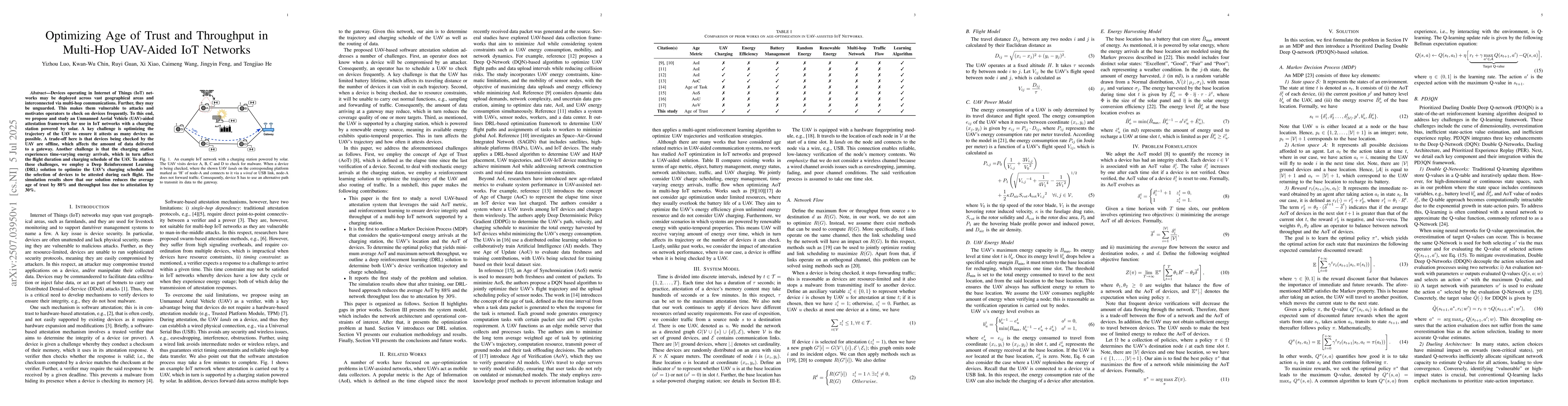 Devices operating in Internet of Things (IoT) networks may be deployed across vast geographical areas and interconnected via multi-hop communications. Further, they may be unguarded. This makes them vulnerable to attacks and motivates operators to check on devices frequently. To this end, we propose and study an Unmanned Aerial Vehicle (UAV)-aided attestation framework for use in IoT networks with a charging station powered by solar. A key challenge is optimizing the trajectory of the UAV to ensure it attests as many devices as possible. A trade-off here is that devices being checked by the UAV are offline, which affects the amount of data delivered to a gateway. Another challenge is that the charging station experiences time-varying energy arrivals, which in turn affect the flight duration and charging schedule of the UAV. To address these challenges, we employ a Deep Reinforcement Learning (DRL) solution to optimize the UAV's charging schedule and the selection of devices to be attested during each flight. The simulation results show that our solution reduces the average age of trust by 88% and throughput loss due to attestation by 30%.
