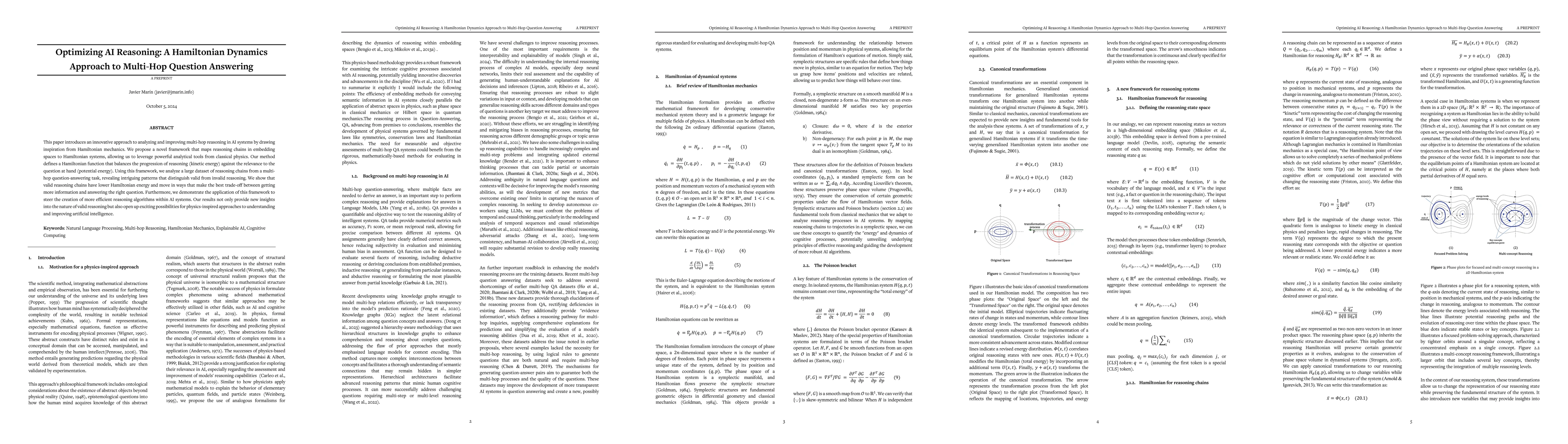 This paper presents a novel framework inspired by Hamiltonian mechanics to enhance multi-hop reasoning in AI systems, showing that valid reasoning chains exhibit lower Hamiltonian energy and better balance information gain with question relevance. The proposed approach offers insights into improving reasoning algorithms.