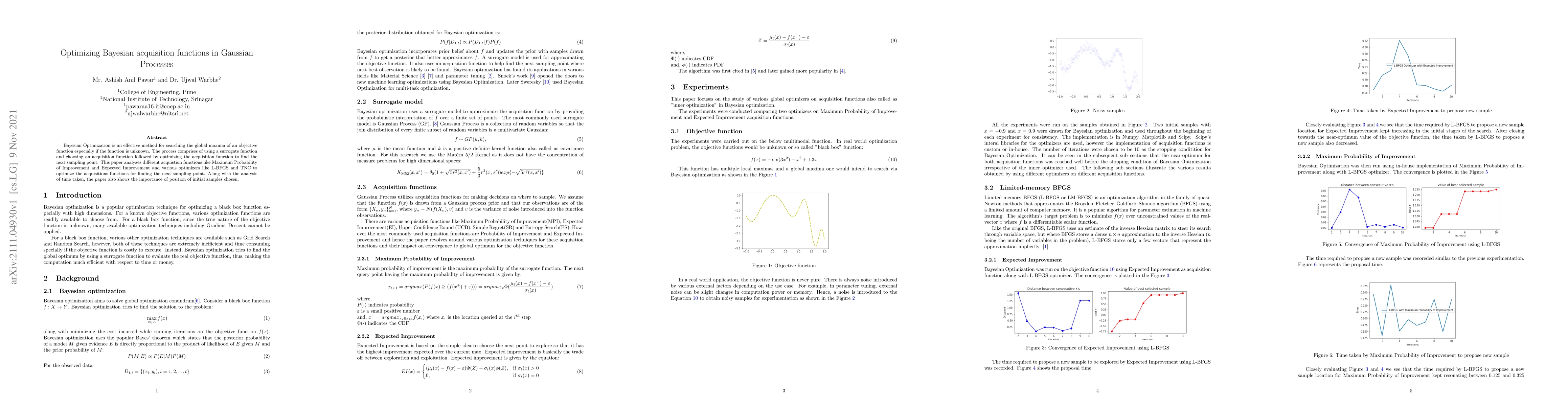 Bayesian Optimization is an effective method for searching the global maxima of an objective function especially if the function is unknown. The process comprises of using a surrogate function and choosing an acquisition function followed by optimizing the acquisition function to find the next sampling point. This paper analyzes different acquistion functions like Maximum Probability of Improvement and Expected Improvement and various optimizers like L-BFGS and TNC to optimize the acquisitions functions for finding the next sampling point. Along with the analysis of time taken, the paper also shows the importance of position of initial samples chosen.
