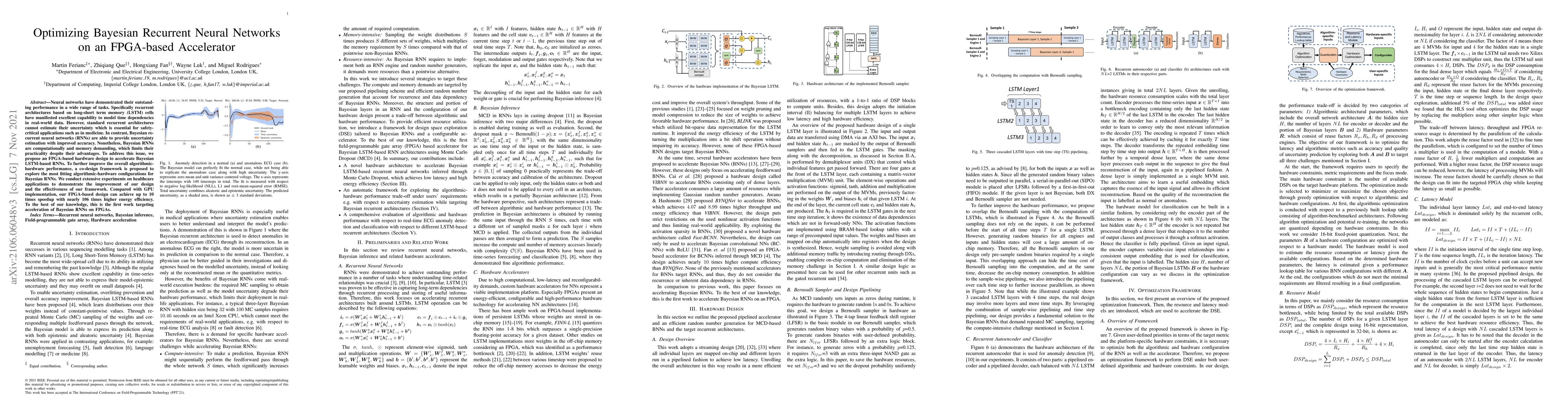 This paper proposes an FPGA-based accelerator to optimize Bayesian Recurrent Neural Networks (RNNs), specifically LSTM cells, for improved performance and energy efficiency. The co-design framework aims to find optimal algorithmic-hardware configurations, achieving up to 10 times speedup and 106 times higher energy efficiency compared to GPU implementations, demonstrating its effectiveness in healthcare applications.