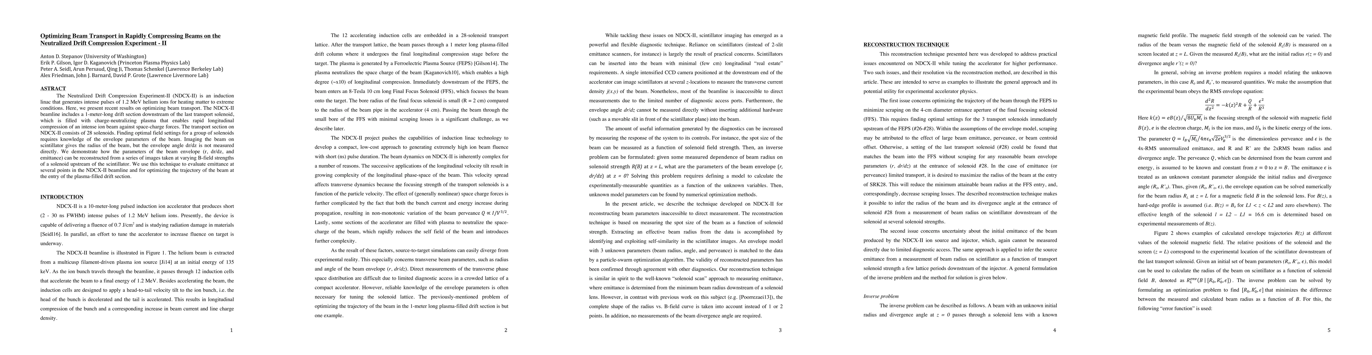 This paper explores optimizing beam transport in the NDCX-II induction linac, focusing on the 1-meter drift section filled with charge-neutralizing plasma. The authors reconstruct beam envelope parameters from imaging data to optimize the solenoid settings and trajectory of the beam entering the drift section.