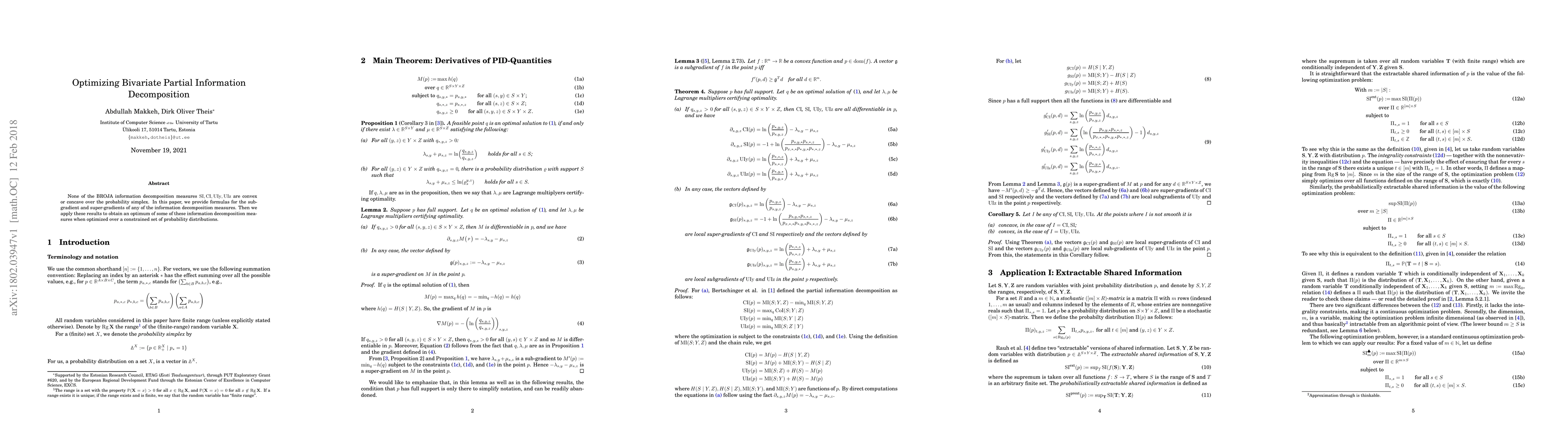 This paper develops sub-gradient and super-gradient formulas for BROJA information decomposition measures, and uses these to optimize measures such as shared information (SI), common information (CI), and unique information (UIy, UIz) over constrained probability distributions.