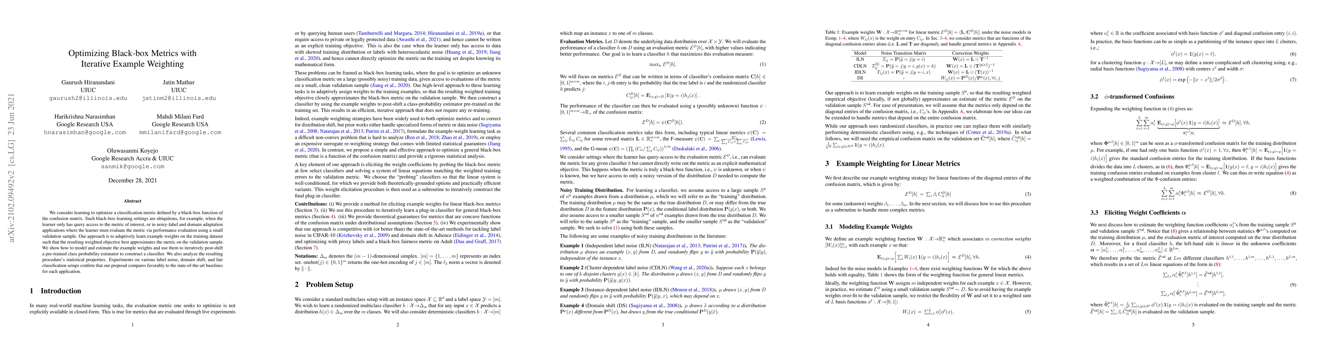 We consider learning to optimize a classification metric defined by a black-box function of the confusion matrix. Such black-box learning settings are ubiquitous, for example, when the learner only has query access to the metric of interest, or in noisy-label and domain adaptation applications where the learner must evaluate the metric via performance evaluation using a small validation sample. Our approach is to adaptively learn example weights on the training dataset such that the resulting weighted objective best approximates the metric on the validation sample. We show how to model and estimate the example weights and use them to iteratively post-shift a pre-trained class probability estimator to construct a classifier. We also analyze the resulting procedure's statistical properties. Experiments on various label noise, domain shift, and fair classification setups confirm that our proposal compares favorably to the state-of-the-art baselines for each application.
