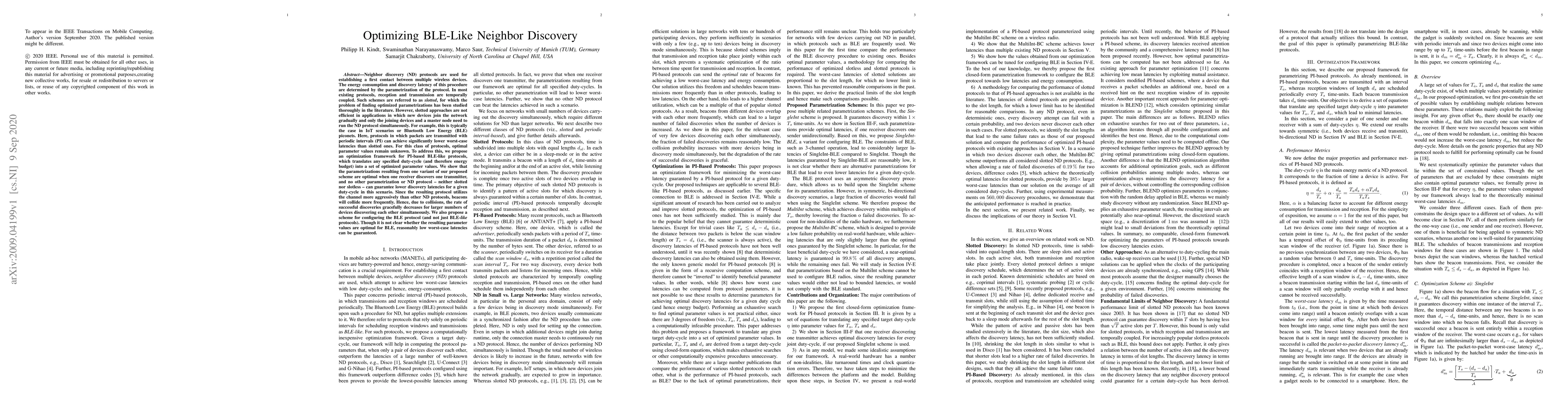 Neighbor discovery (ND) protocols are used for establishing a first contact between multiple wireless devices. The energy consumption and discovery latency of this procedure are determined by the parametrization of the protocol. In most existing protocols, reception and transmission are temporally coupled. Such schemes are referred to as \textit{slotted}, for which the problem of finding optimized parametrizations has been studied thoroughly in the literature. However, slotted approaches are not efficient in applications in which new devices join the network gradually and only the joining devices and a master node need to run the ND protocol simultaneously. For example, this is typically the case in IoT scenarios or Bluetooth Low Energy (BLE) piconets. Here, protocols in which packets are transmitted with periodic intervals (PI) can achieve significantly lower worst-case latencies than slotted ones. For this class of protocols, optimal parameter values remain unknown. To address this, we propose an optimization framework for PI-based BLE-like protocols, which translates any specified duty-cycle (and therefore energy budget) into a set of optimized parameter values. We show that the parametrizations resulting from one variant of our proposed scheme are optimal when one receiver discovers one transmitter, and no other parametrization or ND protocol - neither slotted nor slotless - can guarantee lower discovery latencies for a given duty-cycle in this scenario. Since the resulting protocol utilizes the channel more aggressively than other ND protocols, beacons will collide more frequently. Hence, due to collisions, the rate of successful discoveries gracefully decreases for larger numbers of devices discovering each other simultaneously. We also propose a scheme for configuring the BLE protocol (and not just BLE-\textit{like} protocols).