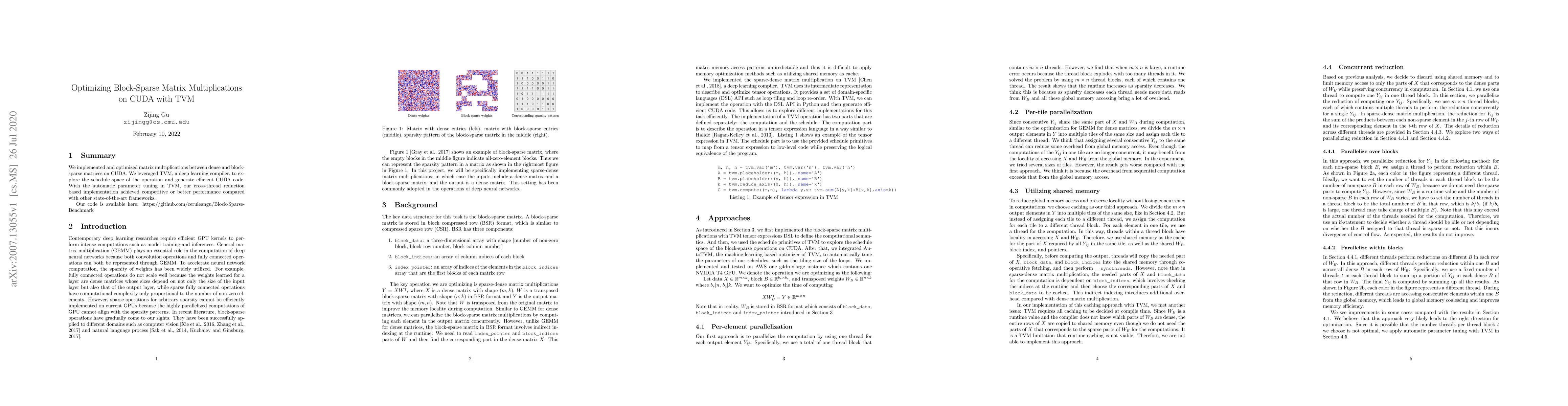This paper optimizes matrix multiplications between dense and block-sparse matrices on CUDA using TVM, achieving competitive performance through automatic parameter tuning and cross-thread reduction techniques. The results show improved efficiency compared to other state-of-the-art frameworks.
