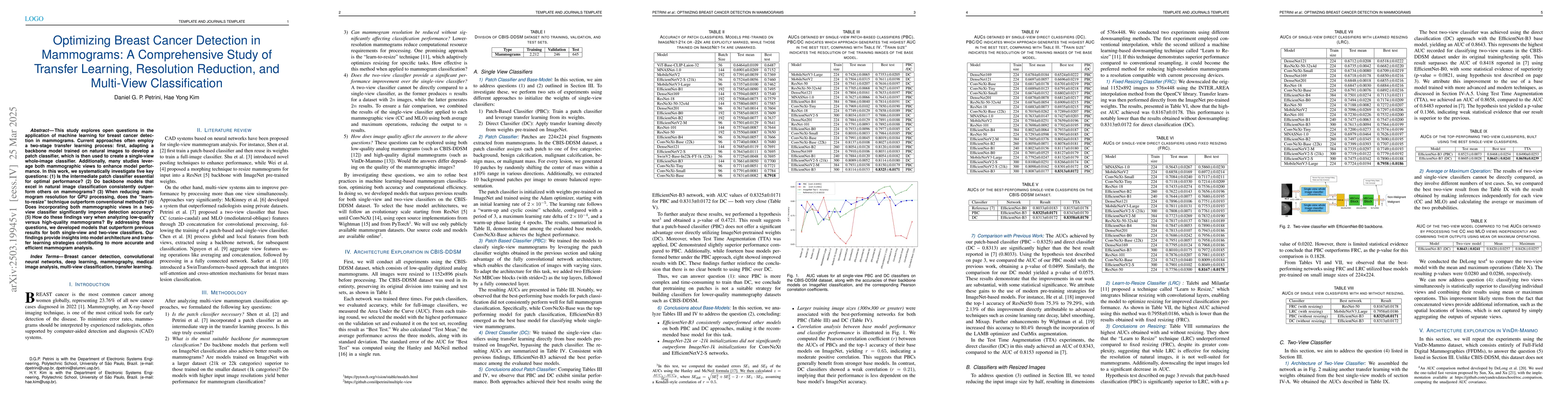 The paper proposes a comprehensive study on transfer learning, resolution reduction, and multi-view classification for breast cancer detection in mammograms, leading to improved models for both single-view and two-view classifiers.