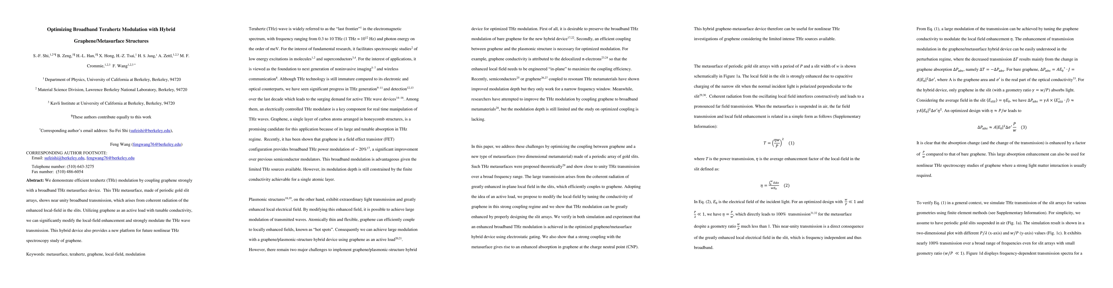 This paper demonstrates efficient broadband terahertz modulation through the coupling of graphene with a high-transmission THz metasurface. The hybrid graphene/metasurface structure allows for significant modulation of THz wave transmission via tunable graphene conductivity, offering a platform for advanced nonlinear THz spectroscopy studies.