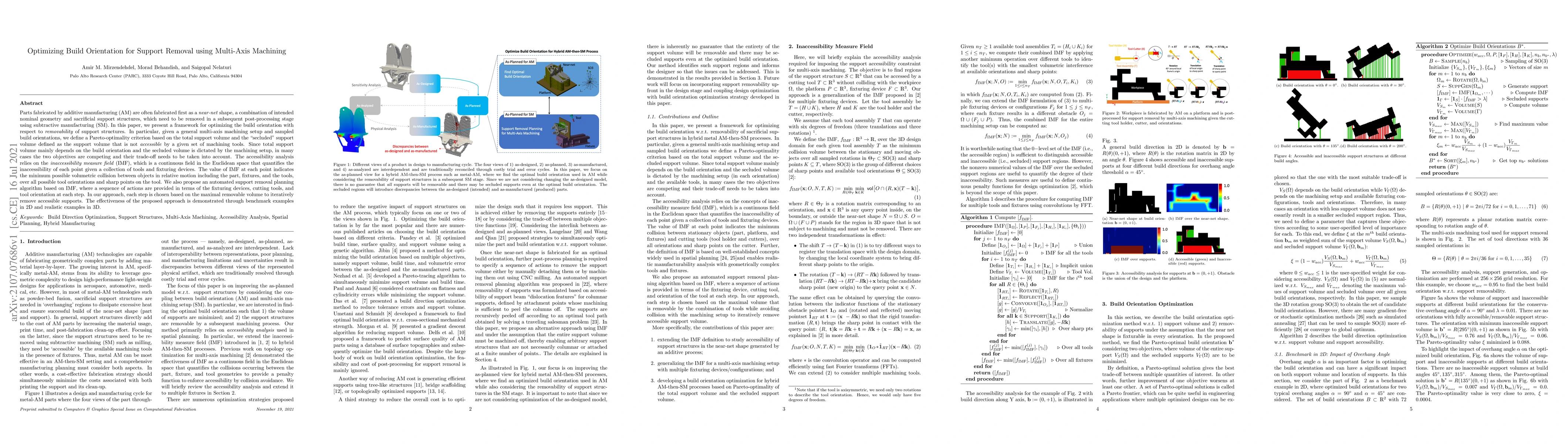 Parts fabricated by additive manufacturing (AM) are often fabricated first as a near-net shape, a combination of intended nominal geometry and sacrificial support structures, which need to be removed in a subsequent post-processing stage using subtractive manufacturing (SM). In this paper, we present a framework for optimizing the build orientation with respect to removability of support structures. In particular, given a general multi-axis machining setup and sampled build orientations, we define a Pareto-optimality criterion based on the total support volume and the "secluded" support volume defined as the support volume that is not accessible by a given set of machining tools. Since total support volume mainly depends on the build orientation and the secluded volume is dictated by the machining setup, in many cases the two objectives are competing and their trade-off needs to be taken into account. The accessibility analysis relies on the inaccessibility measure field (IMF), which is a continuous field in the Euclidean space that quantifies the inaccessibility of each point given a collection of tools and fixturing devices. The value of IMF at each point indicates the minimum possible volumetric collision between objects in relative motion including the part, fixtures, and the tools, over all possible tool orientations and sharp points on the tool. We also propose an automated support removal planning algorithm based on IMF, where a sequence of actions are provided in terms of the fixturing devices, cutting tools, and tool orientation at each step. In our approach, each step is chosen based on the maximal removable volume to iteratively remove accessible supports. The effectiveness of the proposed approach is demonstrated through benchmark examples in 2D and realistic examples in 3D.