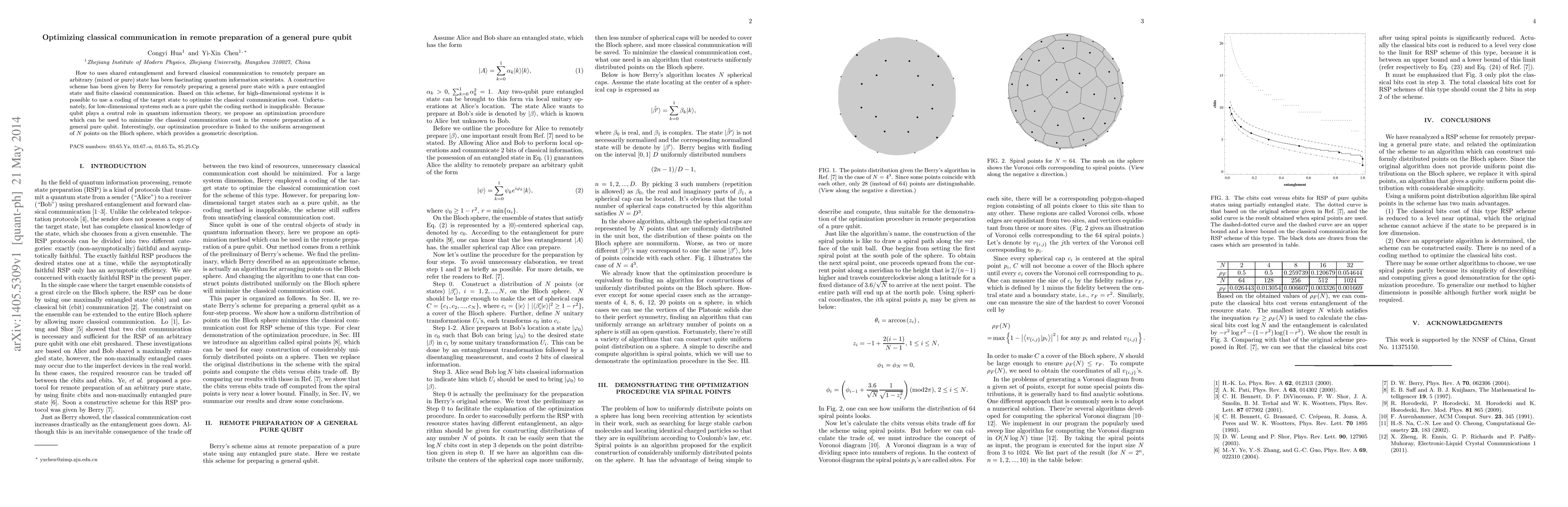 This paper proposes an optimization procedure to minimize classical communication in remotely preparing a general pure qubit using shared entanglement. The method is linked to the uniform arrangement of points on the Bloch sphere, offering a geometric perspective on the problem.