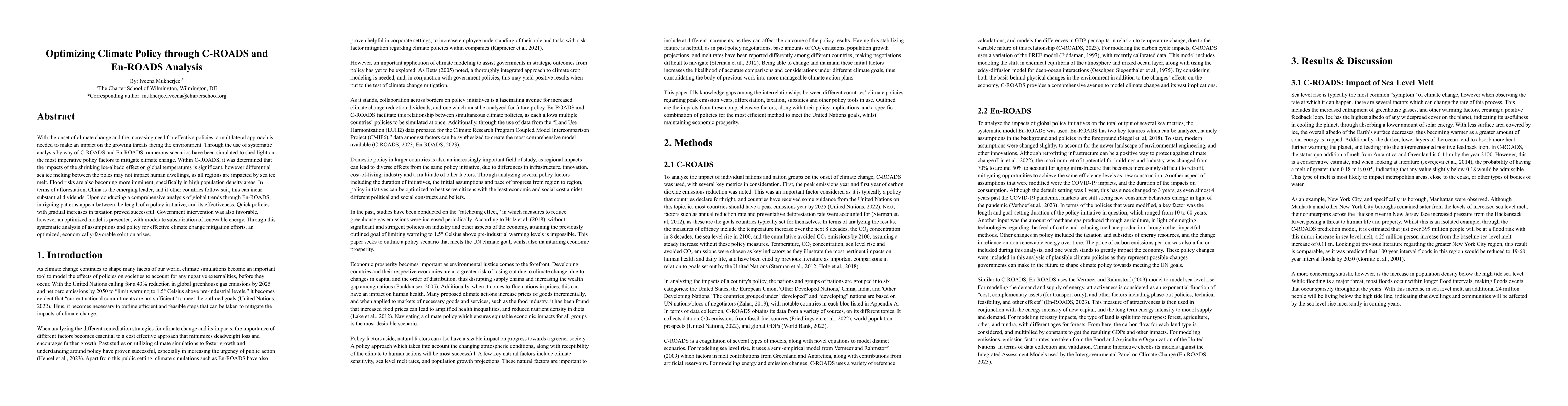 With the onset of climate change and the increasing need for effective policies, a multilateral approach is needed to make an impact on the growing threats facing the environment. Through the use of systematic analysis by way of C-ROADS and En-ROADS, numerous scenarios have been simulated to shed light on the most imperative policy factors to mitigate climate change. Within C-ROADS, it was determined that the impacts of the shrinking ice-albedo effect on global temperatures is significant, however differential sea ice melting between the poles may not impact human dwellings, as all regions are impacted by sea ice melt. Flood risks are also becoming more imminent, specifically in high population density areas. In terms of afforestation, China is the emerging leader, and if other countries follow suit, this can incur substantial dividends. Upon conducting a comprehensive analysis of global trends through En-ROADS, intriguing patterns appear between the length of a policy initiative, and its effectiveness. Quick policies with gradual increases in taxation proved successful. Government intervention was also favorable, however an optimized model is presented, with moderate subsidization of renewable energy. Through this systematic analysis of assumptions and policy for effective climate change mitigation efforts, an optimized, economically-favorable solution arises.