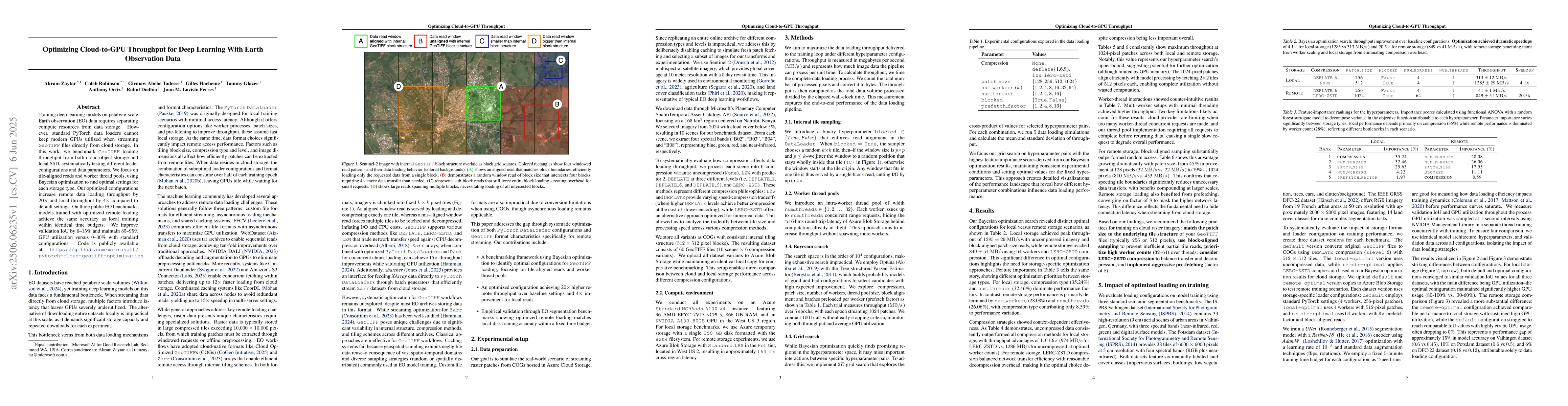 Optimizing cloud-to-GPU throughput for deep learning models trained on petabyte-scale Earth observation data improves remote loading speeds by 20x and local loading speeds by 4x, with no loss of accuracy or GPU utilization.