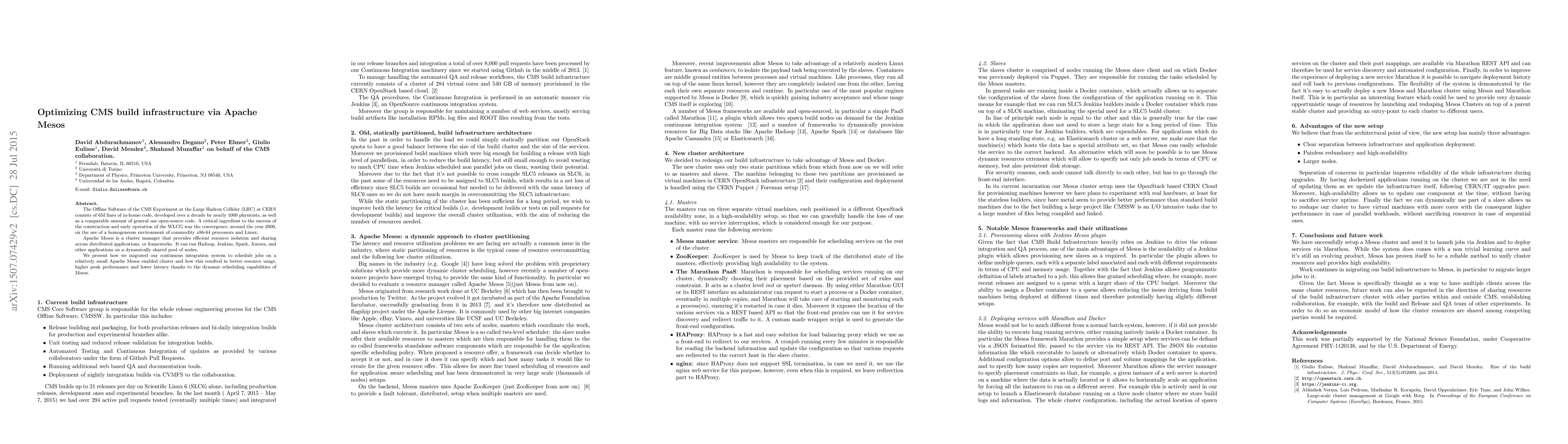 The Offline Software of the CMS Experiment at the Large Hadron Collider (LHC) at CERN consists of 6M lines of in-house code, developed over a decade by nearly 1000 physicists, as well as a comparable amount of general use open-source code. A critical ingredient to the success of the construction and early operation of the WLCG was the convergence, around the year 2000, on the use of a homogeneous environment of commodity x86-64 processors and Linux. Apache Mesos is a cluster manager that provides efficient resource isolation and sharing across distributed applications, or frameworks. It can run Hadoop, Jenkins, Spark, Aurora, and other applications on a dynamically shared pool of nodes. We present how we migrated our continuos integration system to schedule jobs on a relatively small Apache Mesos enabled cluster and how this resulted in better resource usage, higher peak performance and lower latency thanks to the dynamic scheduling capabilities of Mesos.