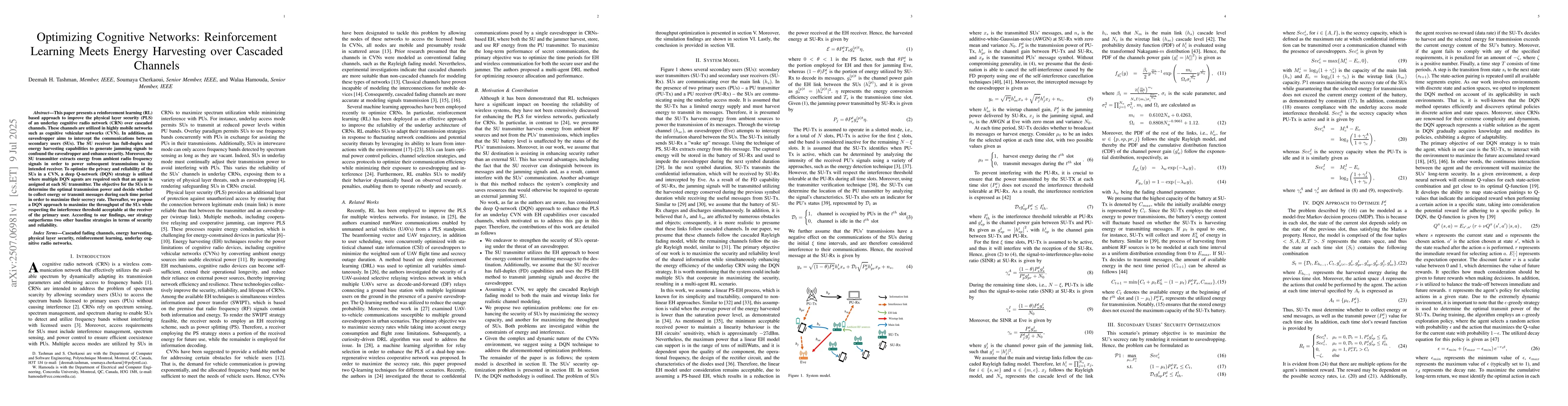 This paper presents a reinforcement learning (RL) based approach to improve the physical layer security (PLS) of an underlay cognitive radio network (CRN) over cascaded channels. These channels are utilized in highly mobile networks such as cognitive vehicular networks (CVN). In addition, an eavesdropper aims to intercept the communications between secondary users (SUs). The SU receiver has full-duplex and energy harvesting capabilities to generate jamming signals to confound the eavesdropper and enhance security. Moreover, the SU transmitter extracts energy from ambient radio frequency signals in order to power subsequent transmissions to its intended receiver. To optimize the privacy and reliability of the SUs in a CVN, a deep Q-network (DQN) strategy is utilized where multiple DQN agents are required such that an agent is assigned at each SU transmitter. The objective for the SUs is to determine the optimal transmission power and decide whether to collect energy or transmit messages during each time period in order to maximize their secrecy rate. Thereafter, we propose a DQN approach to maximize the throughput of the SUs while respecting the interference threshold acceptable at the receiver of the primary user. According to our findings, our strategy outperforms two other baseline strategies in terms of security and reliability.