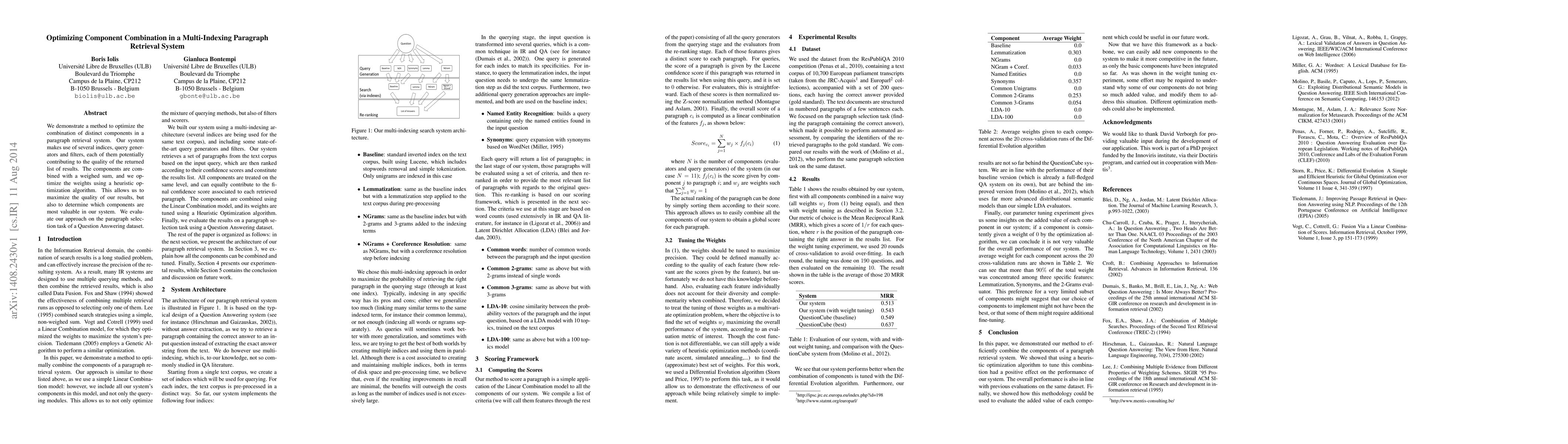 We demonstrate a method to optimize the combination of distinct components in a paragraph retrieval system. Our system makes use of several indices, query generators and filters, each of them potentially contributing to the quality of the returned list of results. The components are combined with a weighed sum, and we optimize the weights using a heuristic optimization algorithm. This allows us to maximize the quality of our results, but also to determine which components are most valuable in our system. We evaluate our approach on the paragraph selection task of a Question Answering dataset.