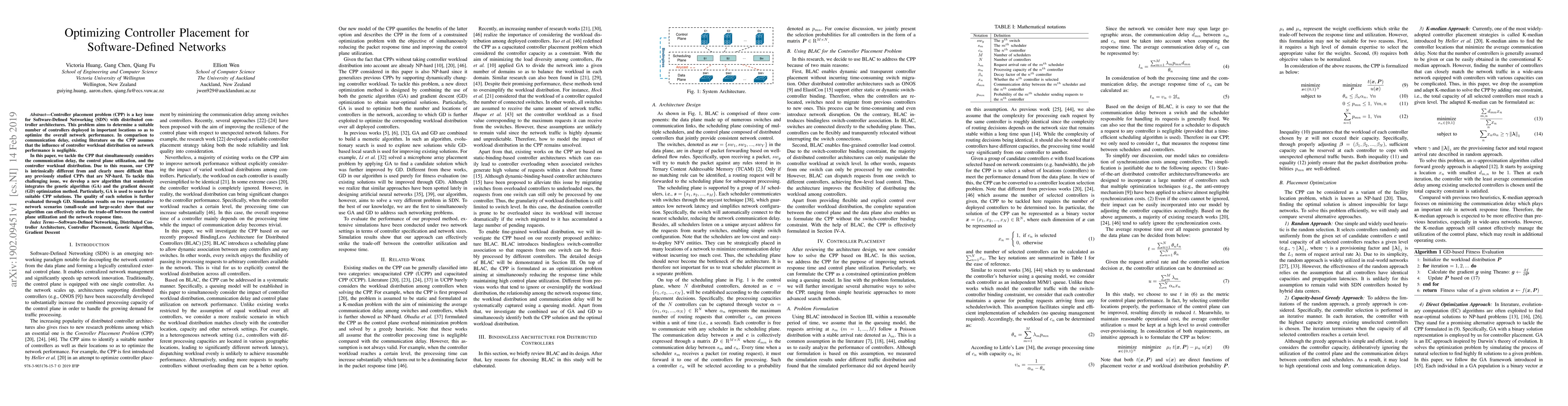This paper addresses the complex controller placement problem in Software-Defined Networks by considering communication delay, control plane utilization, and controller workload distribution. It proposes a hybrid algorithm combining genetic algorithms and gradient descent to optimize controller placement, demonstrating superior performance in balancing control plane utilization and network response time.