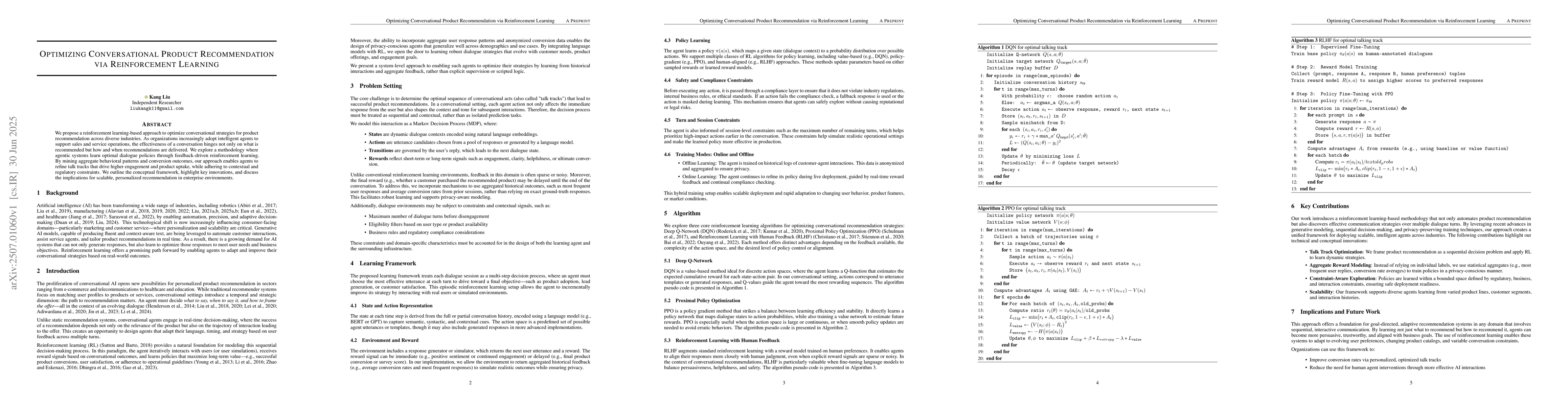 We propose a reinforcement learning-based approach to optimize conversational strategies for product recommendation across diverse industries. As organizations increasingly adopt intelligent agents to support sales and service operations, the effectiveness of a conversation hinges not only on what is recommended but how and when recommendations are delivered. We explore a methodology where agentic systems learn optimal dialogue policies through feedback-driven reinforcement learning. By mining aggregate behavioral patterns and conversion outcomes, our approach enables agents to refine talk tracks that drive higher engagement and product uptake, while adhering to contextual and regulatory constraints. We outline the conceptual framework, highlight key innovations, and discuss the implications for scalable, personalized recommendation in enterprise environments.