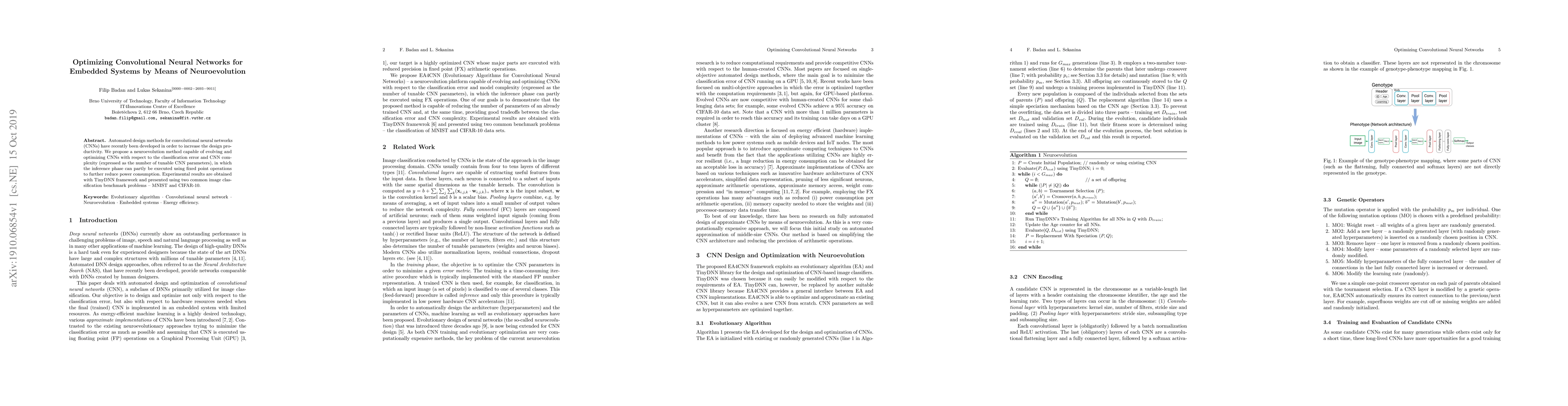 Researchers propose a neuroevolution method to optimize convolutional neural networks for embedded systems, reducing power consumption while maintaining accuracy, using fixed point operations.