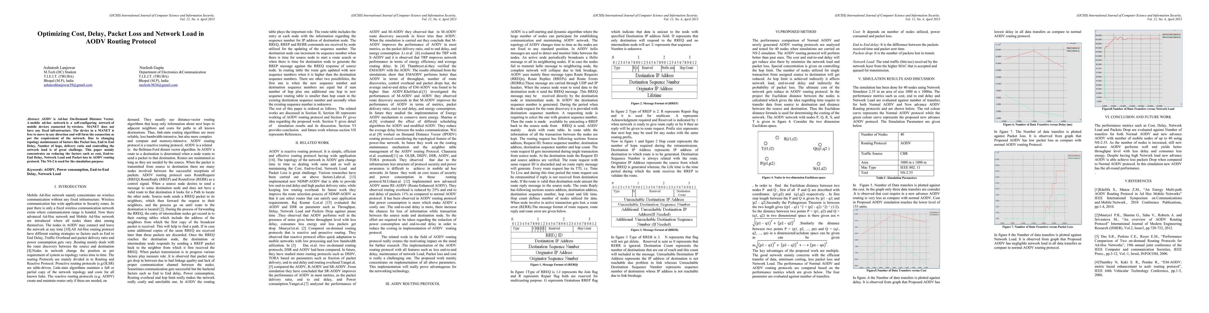 AODV is Ad-hoc On-Demand Distance Vector.A mobile ad-hoc network is a self-configuring network of mobile devices connected by wireless. MANET does not have any fixed infrastructure. The device in a MANET is free to move in any direction and will form the connection as per the requirement of the network. Due to changing topology maintenance of factors like Packet loss, End to End Delay, Number of hops, delivery ratio and controlling the network load is of great challenge. This paper mainly concentrates on reducing the factors such as cost, End-to-End Delay, Network Load and Packet loss in AODV routing protocol. The NS-2 is used for the simulation purpose.