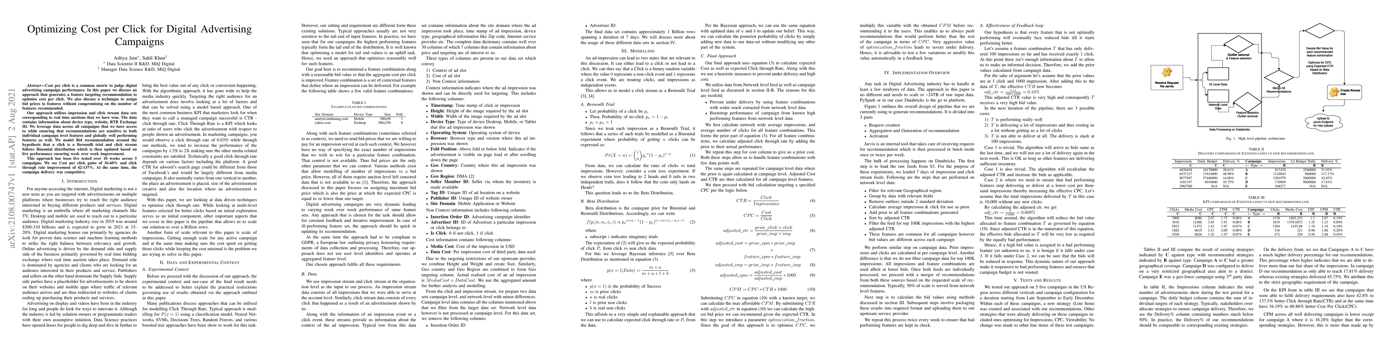 This paper proposes a method to optimize cost per click in digital advertising campaigns by generating feature targeting recommendations and assigning bid prices based on real-time auction data. The approach shows significant improvements in cost per click and click-through rates across multiple campaigns.