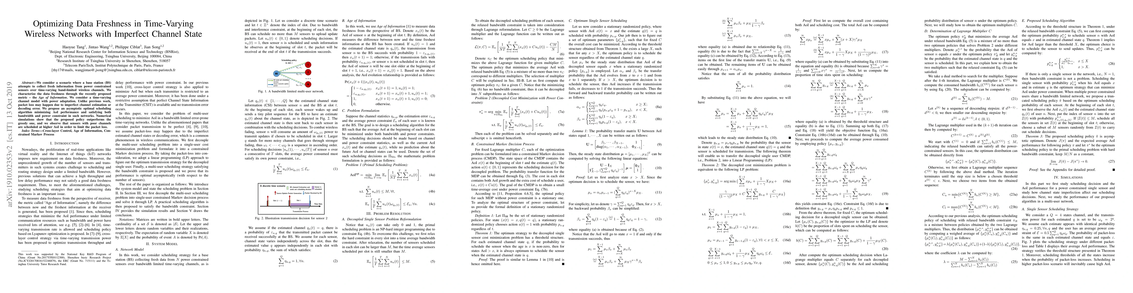 This paper proposes an optimal scheduling algorithm to minimize the Age of Information (AoI) in time-varying wireless networks with power-constrained sensors and imperfect channel state. The algorithm effectively balances bandwidth and power constraints while reducing packet loss due to channel imperfections.