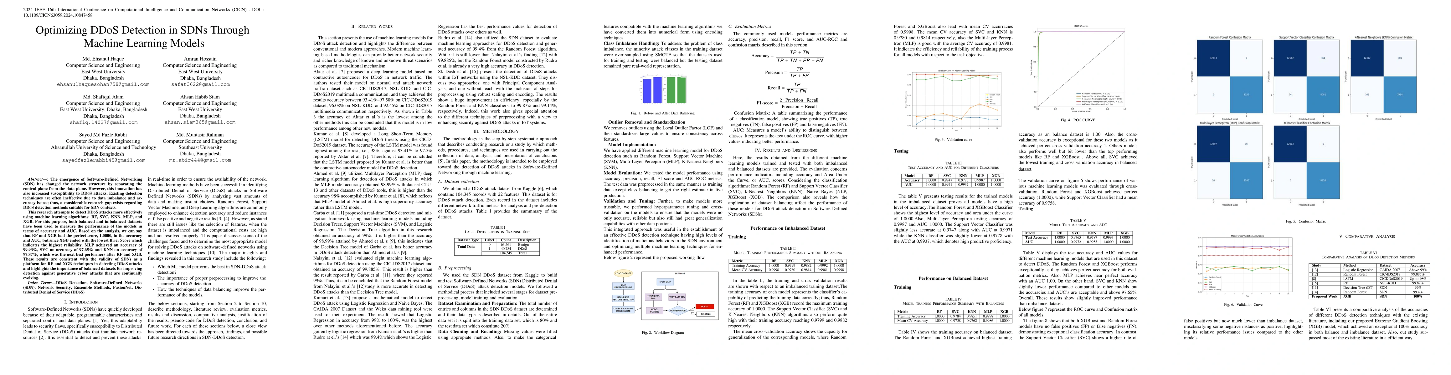 The study presents an optimized DDoS detection approach using machine learning models tailored for SDN architectures, providing insights into model performance with balanced datasets.
