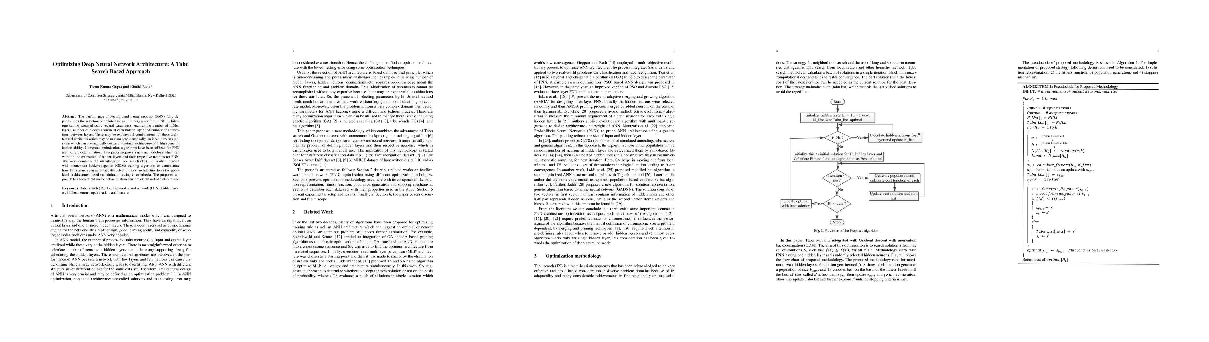 The performance of Feedforward neural network (FNN) fully de-pends upon the selection of architecture and training algorithm. FNN architecture can be tweaked using several parameters, such as the number of hidden layers, number of hidden neurons at each hidden layer and number of connections between layers. There may be exponential combinations for these architectural attributes which may be unmanageable manually, so it requires an algorithm which can automatically design an optimal architecture with high generalization ability. Numerous optimization algorithms have been utilized for FNN architecture determination. This paper proposes a new methodology which can work on the estimation of hidden layers and their respective neurons for FNN. This work combines the advantages of Tabu search (TS) and Gradient descent with momentum backpropagation (GDM) training algorithm to demonstrate how Tabu search can automatically select the best architecture from the populated architectures based on minimum testing error criteria. The proposed approach has been tested on four classification benchmark dataset of different size.