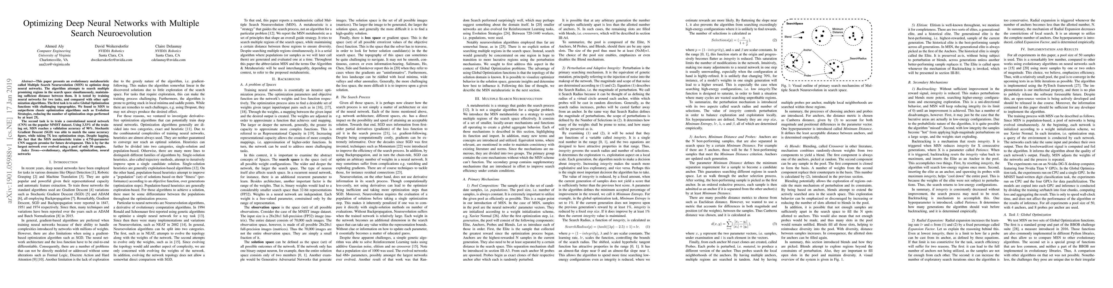 This paper presents an evolutionary metaheuristic called Multiple Search Neuroevolution (MSN) to optimize deep neural networks. The algorithm attempts to search multiple promising regions in the search space simultaneously, maintaining sufficient distance between them. It is tested by training neural networks for two tasks, and compared with other optimization algorithms. The first task is to solve Global Optimization functions with challenging topographies. We found to MSN to outperform classic optimization algorithms such as Evolution Strategies, reducing the number of optimization steps performed by at least 2X. The second task is to train a convolutional neural network (CNN) on the popular MNIST dataset. Using 3.33% of the training set, MSN reaches a validation accuracy of 90%. Stochastic Gradient Descent (SGD) was able to match the same accuracy figure, while taking 7X less optimization steps. Despite lagging, the fact that the MSN metaheurisitc trains a 4.7M-parameter CNN suggests promise for future development. This is by far the largest network ever evolved using a pool of only 50 samples.